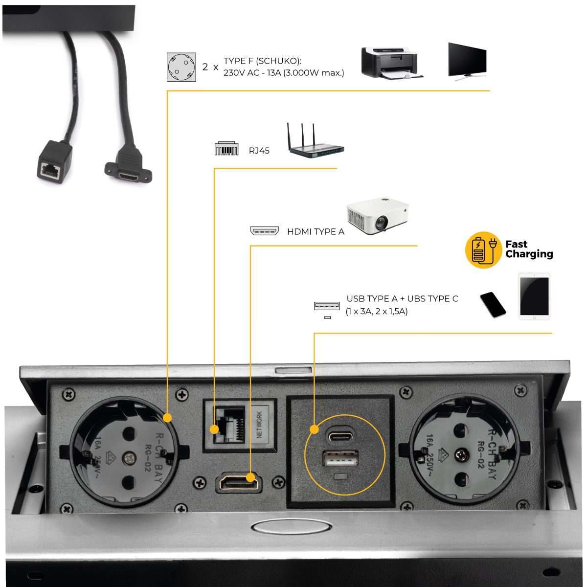 Ha 2 spine Schuko tipo F (EU) con una potenza massima ammissibile fino a 3.000W - 13A, 1 connettore HDMI, 1 porta di rete RJ45 non schermata, 1 connettore USB A e 1 connettore USB C (1x3A, 2x1 . 5A) ricarica rapida e con campo di applicazione di 5V 3A, 9V 2A, 12V 1,5 A.