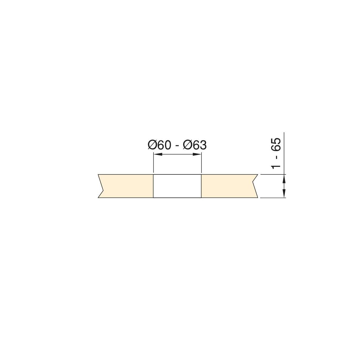 Per la sua istallazione si richiede di un foro D. 60mm. Si fissa al mobile senza neccessità di ferrammenta grazie a un bullone di fissaggio manuale. Ha la possibilità di essere montato in superfici di grande spessore, tra 1 e 65 mm.