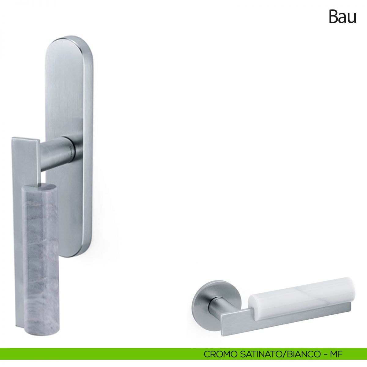 Maniglia per porta interna Bau Olivari con rosetta e bocchetta tonda bassa.