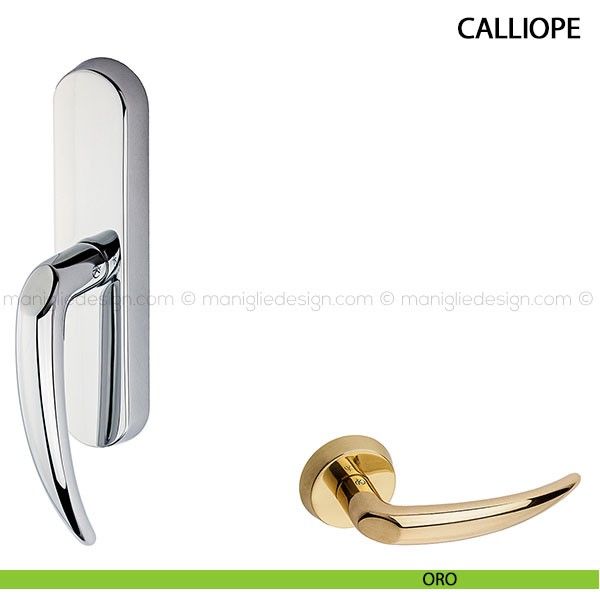 Dimensioni ai minimi termini, riservatezza, misura e una funzione semantica: un segno grammaticale nello spazio, un punto e virgola, una pausa nel testo a indicare con precisione la modalità di fruizione e a ricordare con garbo poetico l'usura del tempo che si accumula dell'ansa d'appoggio per il pollice. Calliope è una maniglia in ottone pressofuso nelle finiture ottone lucido verniciato o cromato lucido.