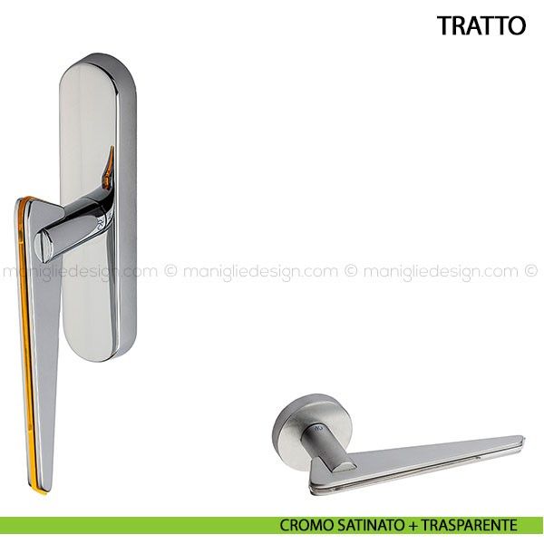 Tratto è un segno lucido, che cattura l'occhio, la luce, e indica la porta con l'ironia fluorescente dell'evidenziatore. E' una linea di colore, una linea d'azione, un'insegna racchiusa in parentesi di metallo cromato o nero profondo che pongono l'oggetto quale ombra di sè stesso me lasciano in risalto la funzione, l'invito a prendere, o lasciare. Tratto è una maniglia in lega leggera e inserto in metacrilato fluorescente La maniglia è disponibile nelle finiture cromo lucido e cromo satinato con inserti in arancio e trasparente.