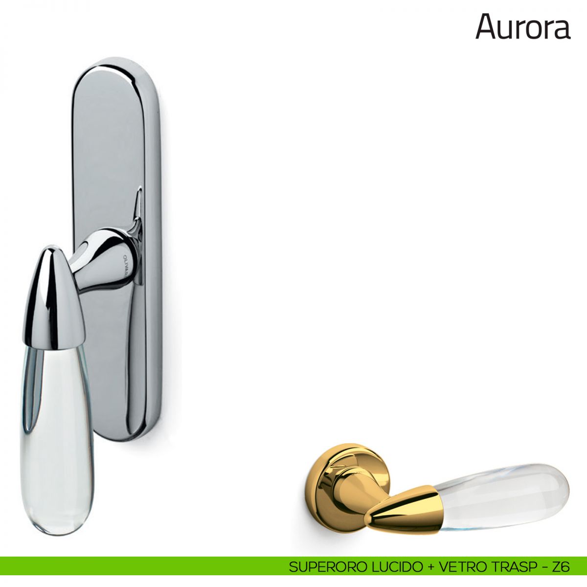 Alessandro Mendini nel 1994 progetta una maniglia che lega due materiali molto diversi, l'ottone e il vetro di Murano. Il designer ebbe l'intuizione di una goccia di vetro trasparente integrata o emergente dal metallo, e così anche l'idea della forma. Aurora Olivari appartiene alla linea di maniglie di design per porte, un prodotto che è riuscito a coniugare la sinergia tra gli artigiani del vetro di Murano, notoriamente non abituati a realizzare manufatti in serie e l'azienda Olivari che si avvale delle più moderne tecnologie nella produzione e lavorazione dell'ottone.