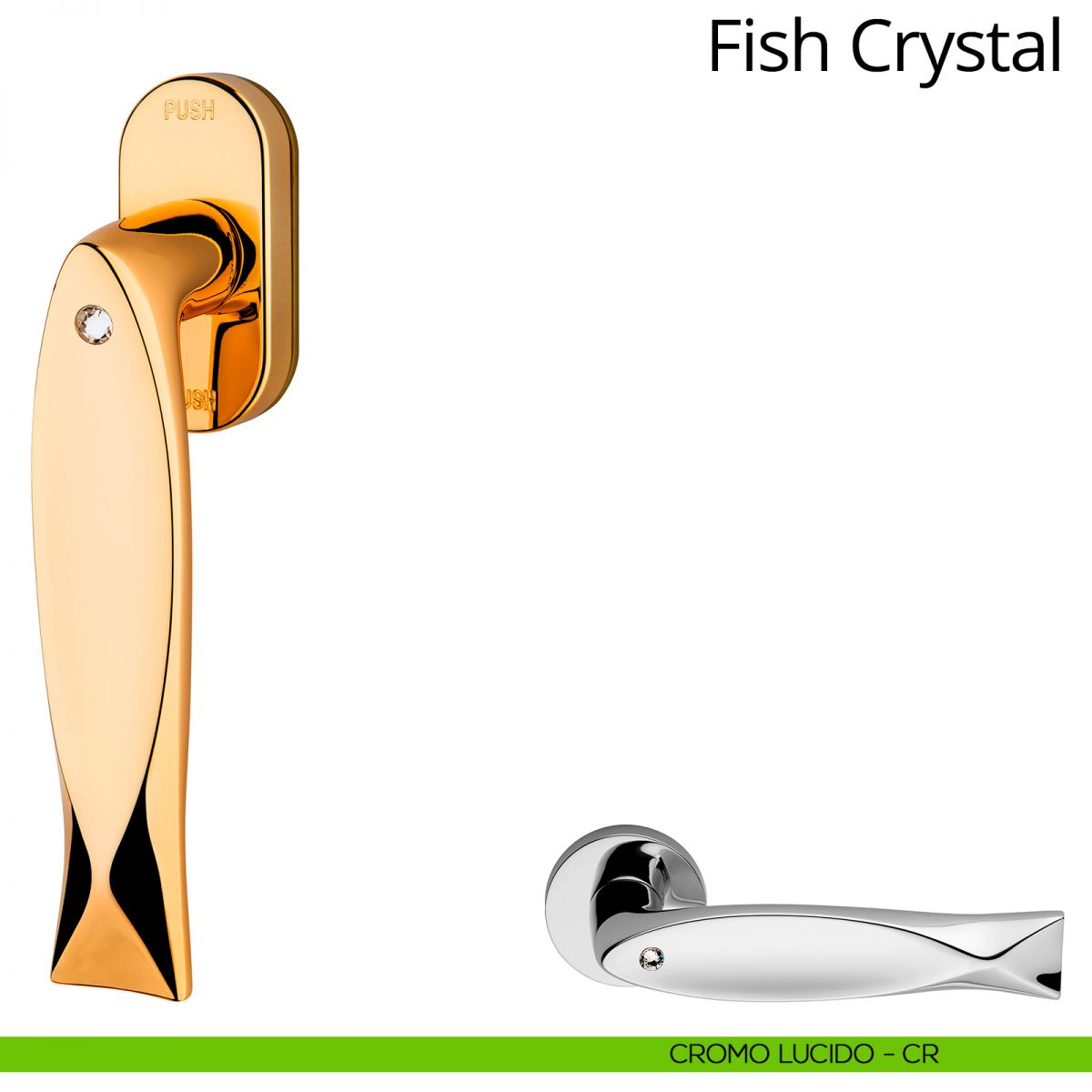 Dal design particolarmente originale, la nuova linea di maniglie Fish Crystal si caratterizza per il particolare “occhio” in cristalli Swarovski® che emana i suoi riflessi iridescenti rendendola “viva”. Questo prezioso elemento infonde un fascino raffinato impreziosito e si riconosciuto dal sigillo “Crystals from SWAROVSKI®”, che funge da certificato di autenticità. La maniglia per porte Fish Crystal Linea Calì risplende di cristalli SWAROVSKI® negli ambienti più esclusivi e importanti rappresentando l’emblema del lusso più contemporaneo.