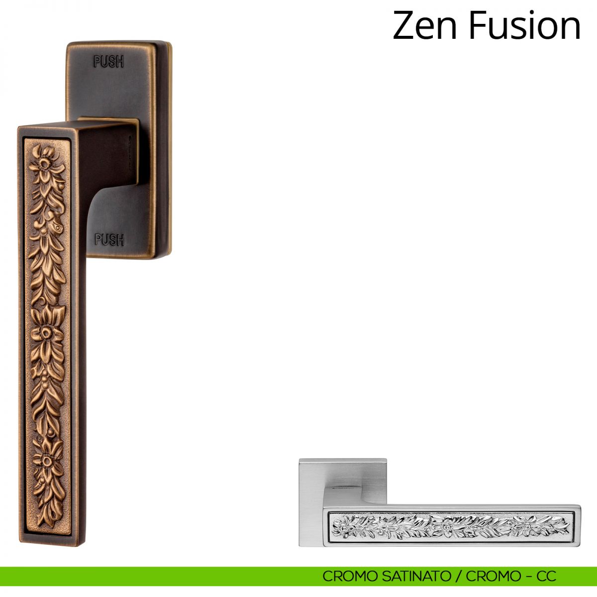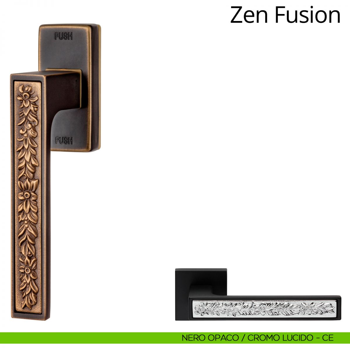 Un mix insolito e irriverente, due correnti stilistiche differenti dialogano e si fondono nell’anima contemporanea della collezione di maniglie per porte e finestre Zen Fusion. È moderna perché le linee dell’impugnatura sono tese e minimali, come impongono gli ulitimi dettami stilistici. Il fronte piatto, perfettamente complanare alla rosetta e/o alla placca, prevede tutti gli spigoli leggermente arrotondati, così da rendere la maniglia oltre che comoda anche sicura. È antica come l’inserto classico dell’impugnatura, contraddistinto da fregi floreali romantici e delicati. Zen fusion è disponibile nel mix oro/cromo lucido, cromo lucido/cromo satinato, cromo lucido/nero opaco, e infine patiné abbinato alla finitura bronzo opaco. In quest’ultima finitura spiccano i decori lavorati da sapienti mani artigiane che, grazie a un lungo e particolarissimo processo di spazzolatura, aumentano visivamente di volume acquisendo una particolarissima tridimensionalità. La maniglia Zen fusion è disponibile anche nella versione anti intrusione equipaggiata con il sistema SmartBlock, il sistema anti furto invisibile unico al mondo. Tutte le maniglie con rosetta sono equipaggiate con il sistema ClickClack che permette a chiunque di montarle in pochi istanti senza la necessità di utensili o viti.
