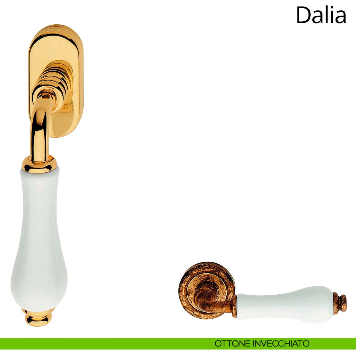 La collezione di maniglie Dalia è un classico della maniglieria italiana, un viaggio oltre il tempo e le mode. Progettata nel lontano 1990, da allora continua a mietere consensi per via delle sue forme morbide, piacevolmente classiche e femminili. La bocchetta minuta è stata ideata consapevolmente per accompagnarsi ai profili stretti dei serramenti in legno di un tempo, mentre la forme “a clessidra” dell’impugnatura accoglie la mano con un’inaspettata sensazione di morbidezza. Ed è proprio l’impugnatura a fare la differenza; le sue delicate proporzioni si bilanciano perfettamente con il gambo e la bocchetta in un susseguirsi di curve e rilievi, leit motiv di questa collezione di maniglie. La preziosa impugnatura in ceramica italiana della collezione Dalia è disponibile in numerose fantasie e colori, fra i quali spicca la porcellana beige (perfetta per tutti i serramenti di legno scuro, come l’iroko), fino all’ultima arrivata: l’insolita porcellana maculata. Degne di nota sono anche le numerose varianti floreali (fiore rosa, fiore marrone e fiore blu) decorate da sapienti mani artigiane. L’ampia gamma di modelli a catalogo consente a Dalia di adattarsi a tutte le tipologie di porte e finestre, mentre le 35 varianti disponibili le permettono di adattarsi a tutte le tipologie di ambienti, dal classico al country-chic.