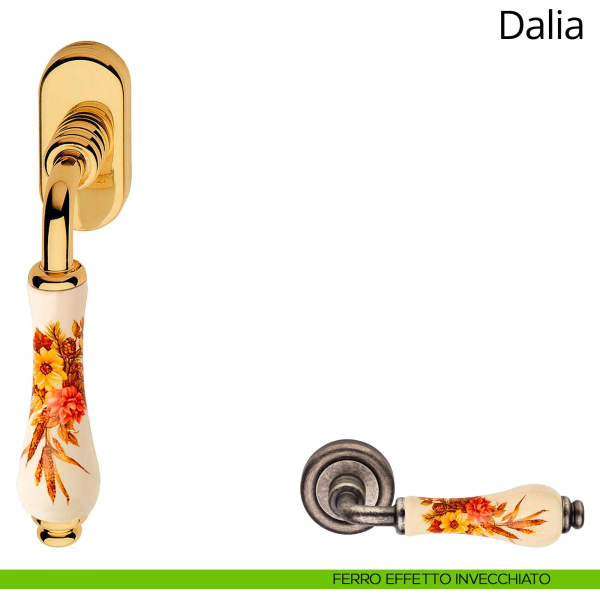 La collezione di maniglie Dalia è un classico della maniglieria italiana, un viaggio oltre il tempo e le mode. Progettata nel lontano 1990, da allora continua a mietere consensi per via delle sue forme morbide, piacevolmente classiche e femminili. La bocchetta minuta è stata ideata consapevolmente per accompagnarsi ai profili stretti dei serramenti in legno di un tempo, mentre la forme “a clessidra” dell’impugnatura accoglie la mano con un’inaspettata sensazione di morbidezza. Ed è proprio l’impugnatura a fare la differenza; le sue delicate proporzioni si bilanciano perfettamente con il gambo e la bocchetta in un susseguirsi di curve e rilievi, leit motiv di questa collezione di maniglie. La preziosa impugnatura in ceramica italiana della collezione Dalia è disponibile in numerose fantasie e colori, fra i quali spicca la porcellana beige (perfetta per tutti i serramenti di legno scuro, come l’iroko), fino all’ultima arrivata: l’insolita porcellana maculata. Degne di nota sono anche le numerose varianti floreali (fiore rosa, fiore marrone e fiore blu) decorate da sapienti mani artigiane. L’ampia gamma di modelli a catalogo consente a Dalia di adattarsi a tutte le tipologie di porte e finestre, mentre le 35 varianti disponibili le permettono di adattarsi a tutte le tipologie di ambienti, dal classico al country-chic.