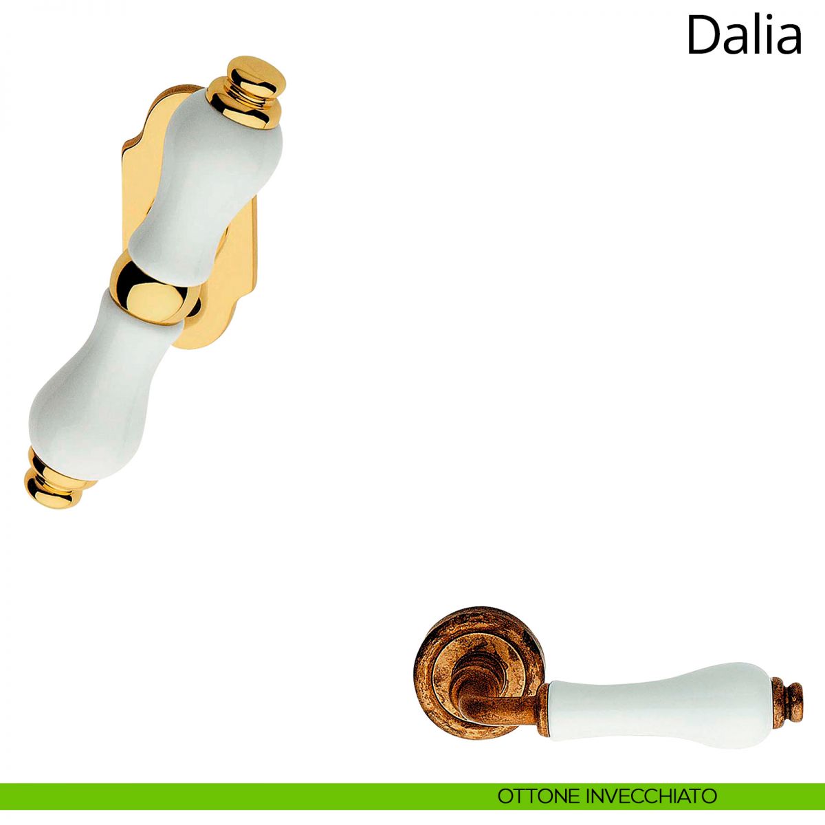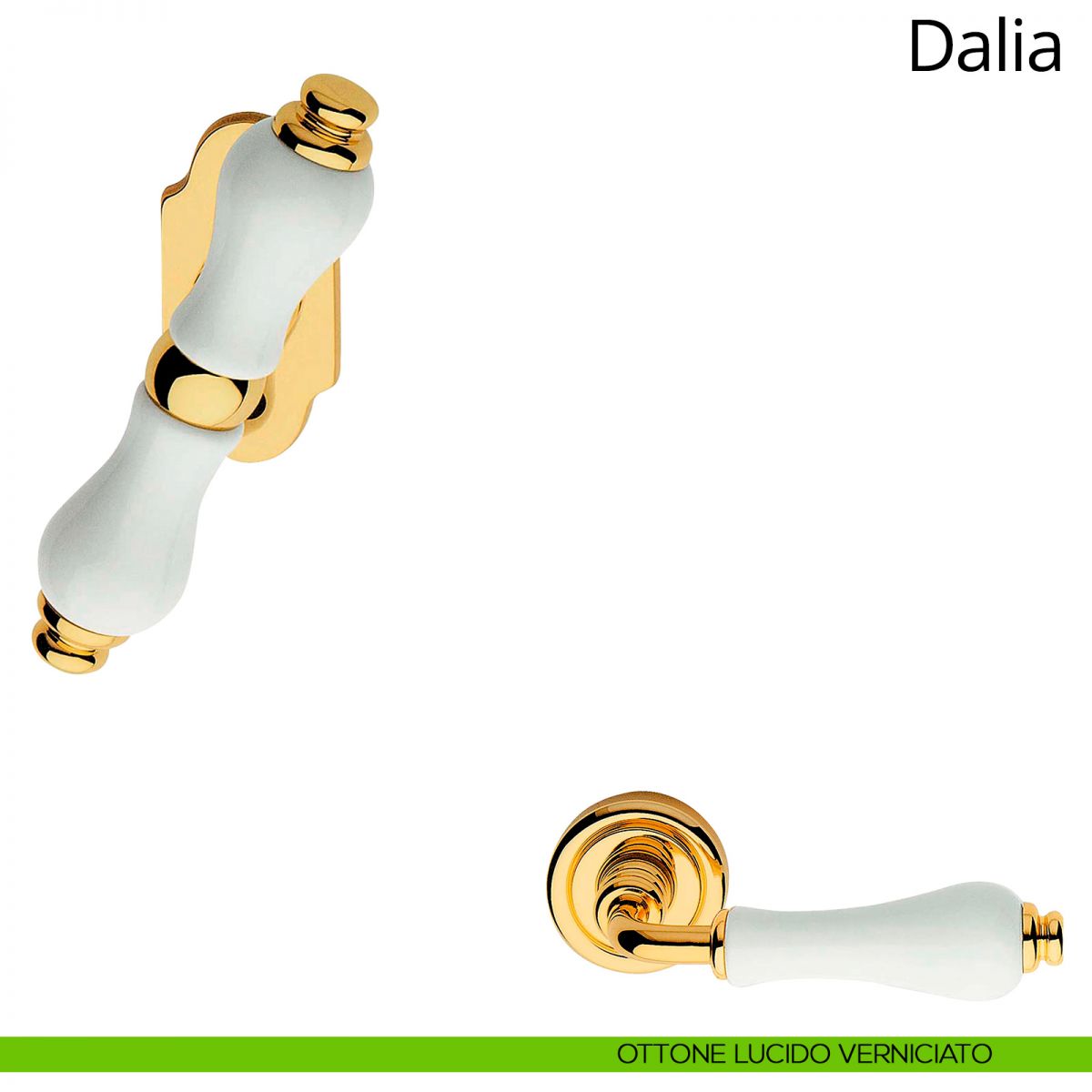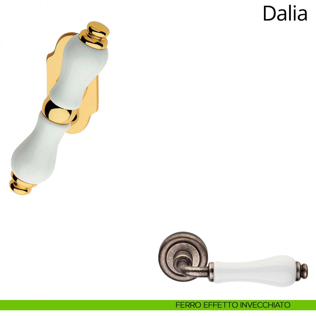 La collezione di maniglie Dalia è un classico della maniglieria italiana, un viaggio oltre il tempo e le mode. Progettata nel lontano 1990, da allora continua a mietere consensi per via delle sue forme morbide, piacevolmente classiche e femminili. La bocchetta minuta è stata ideata consapevolmente per accompagnarsi ai profili stretti dei serramenti in legno di un tempo, mentre la forme “a clessidra” dell’impugnatura accoglie la mano con un’inaspettata sensazione di morbidezza. Ed è proprio l’impugnatura a fare la differenza; le sue delicate proporzioni si bilanciano perfettamente con il gambo e la bocchetta in un susseguirsi di curve e rilievi, leit motiv di questa collezione di maniglie. La preziosa impugnatura in ceramica italiana della collezione Dalia è disponibile in numerose fantasie e colori, fra i quali spicca la porcellana beige (perfetta per tutti i serramenti di legno scuro, come l’iroko), fino all’ultima arrivata: l’insolita porcellana maculata. Degne di nota sono anche le numerose varianti floreali (fiore rosa, fiore marrone e fiore blu) decorate da sapienti mani artigiane. L’ampia gamma di modelli a catalogo consente a Dalia di adattarsi a tutte le tipologie di porte e finestre, mentre le 35 varianti disponibili le permettono di adattarsi a tutte le tipologie di ambienti, dal classico al country-chic.