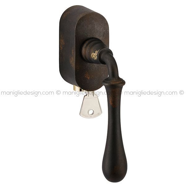 Maniglia per finestra martellina DK con chiave su placca 189 Romea Reguitti. Design by Studio Reguitti.