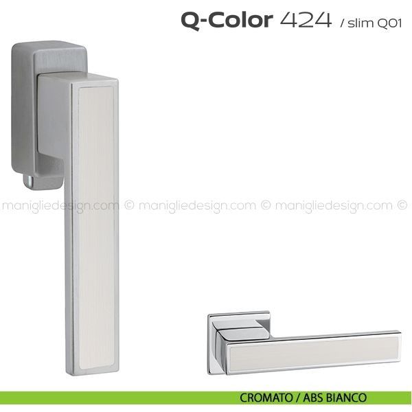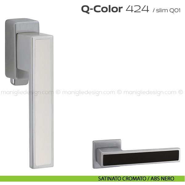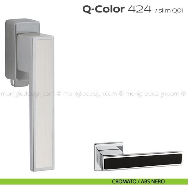 Lo studio di progettazione interno all'azienda Reguitti progetta una nuova serie di maniglie per finestre chiamata 424 Q-Color Reguitti. Sicura nella presa, leggera nei volumi, raffinata nell'abbinamento tra inserti in ABS di colore diverso, Q-Color rappresenta un piacevole connubio fra robustezza e creatività. Capace di inserirsi con carattere e personalità sulle superfici di porte dal design moderno abbinando la cromaticità dell'inserto al colore della porta.