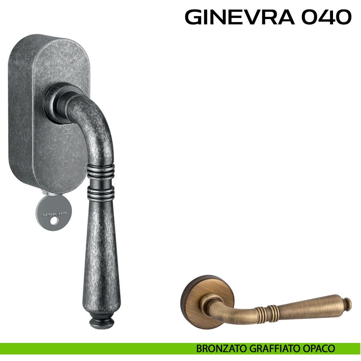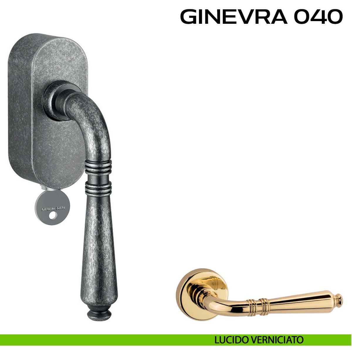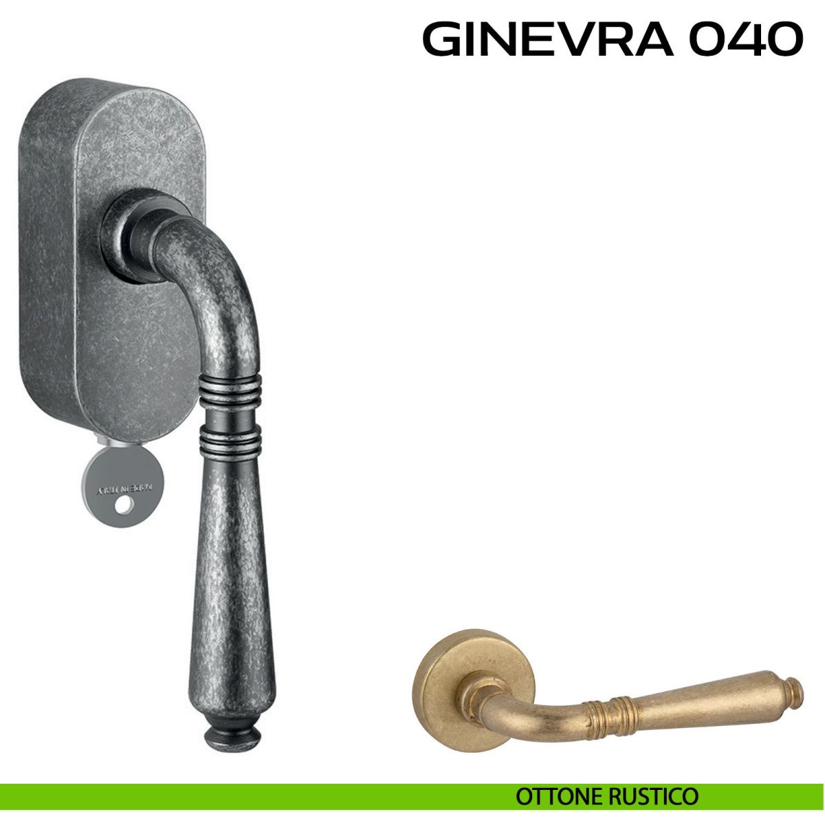 Maniglia per finestra martellina DK con chiave su placca Ginevra 040 Reguitti. Design by Studio Reguitti.