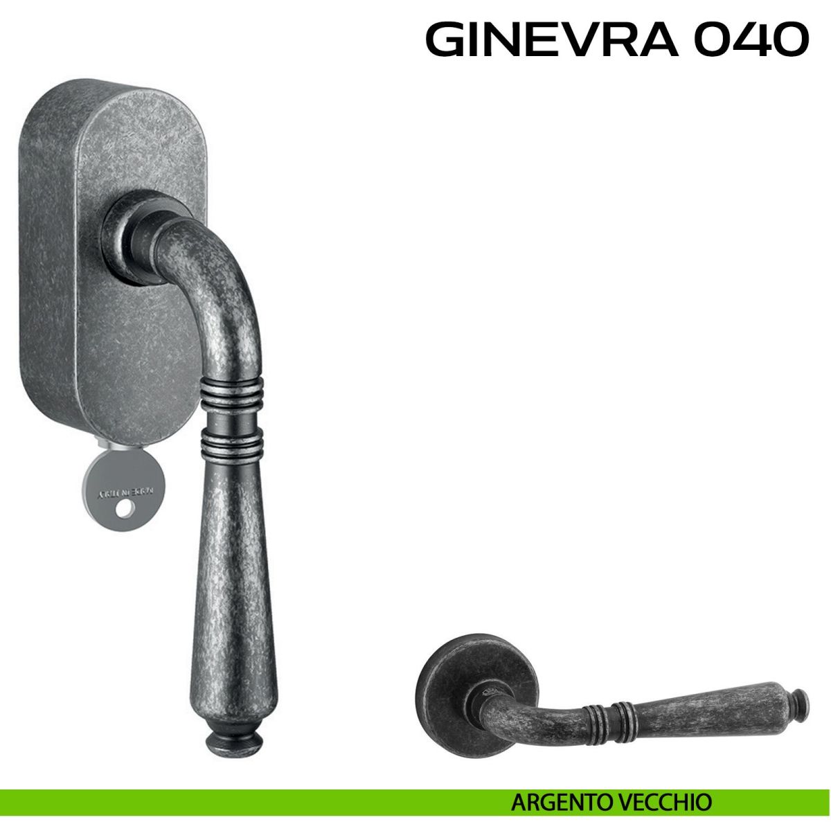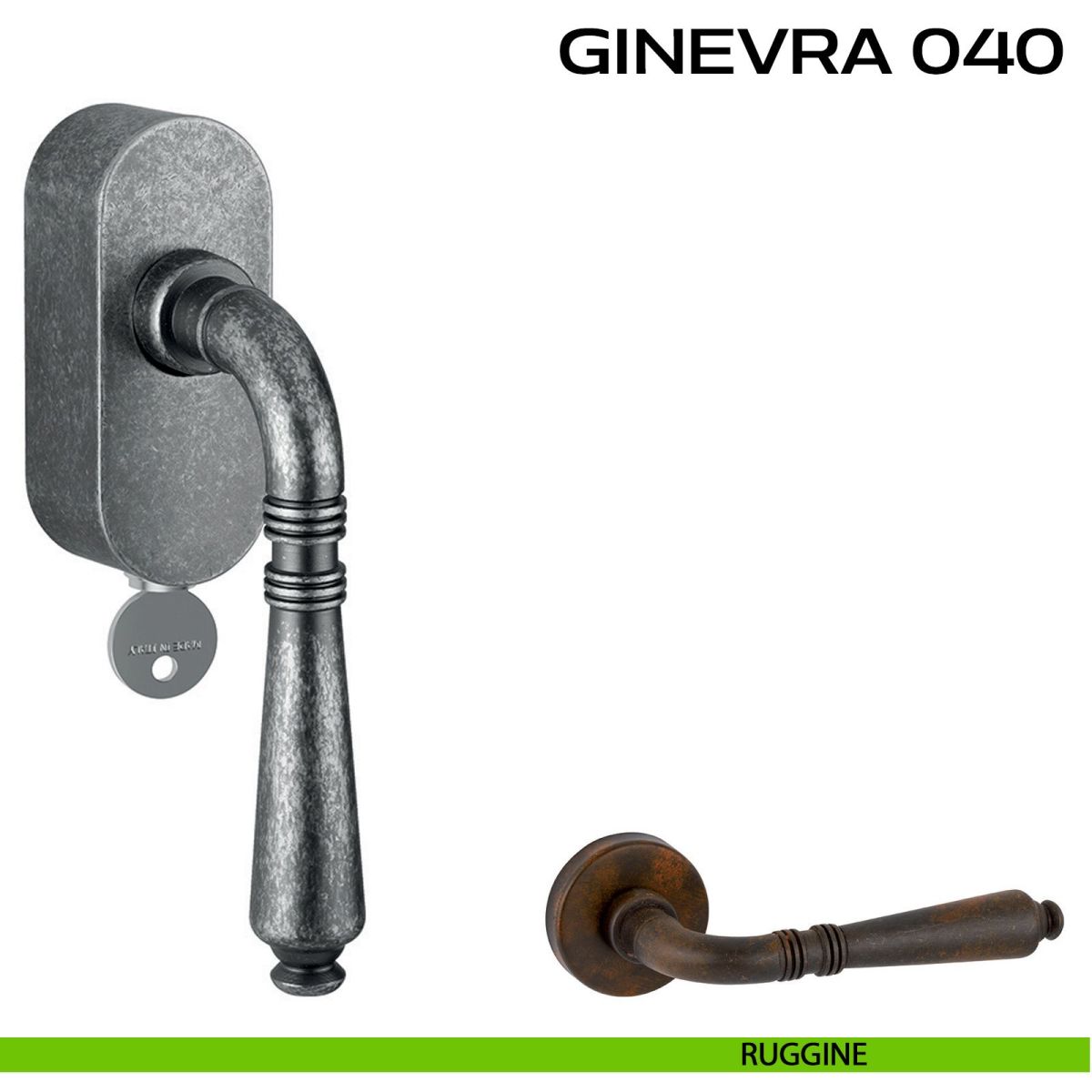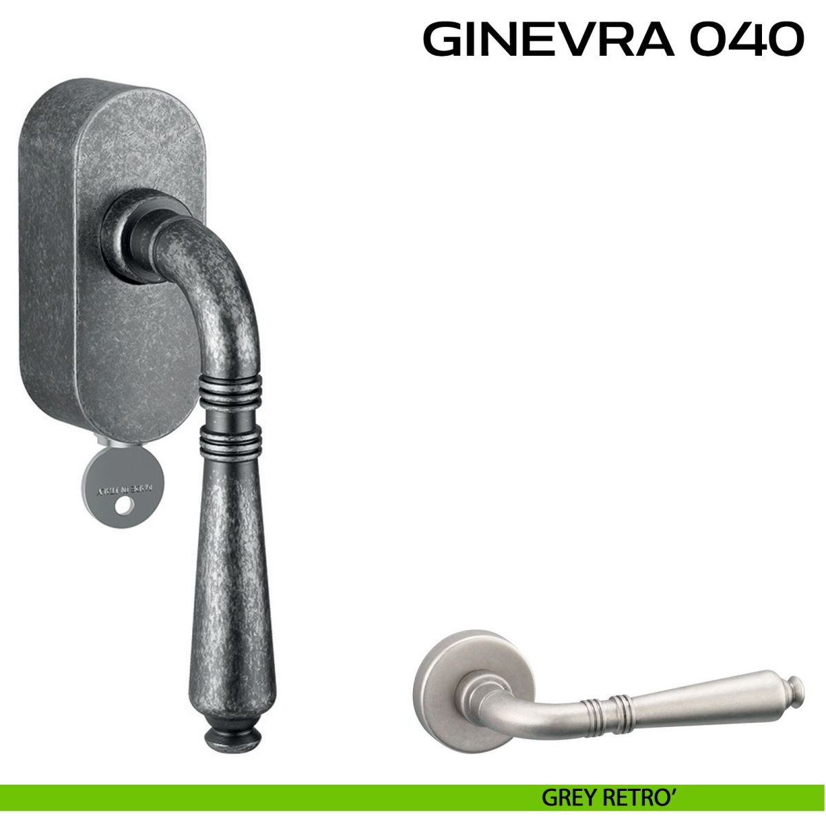 Maniglia per finestra martellina DK con chiave su placca Ginevra 040 Reguitti. Design by Studio Reguitti.