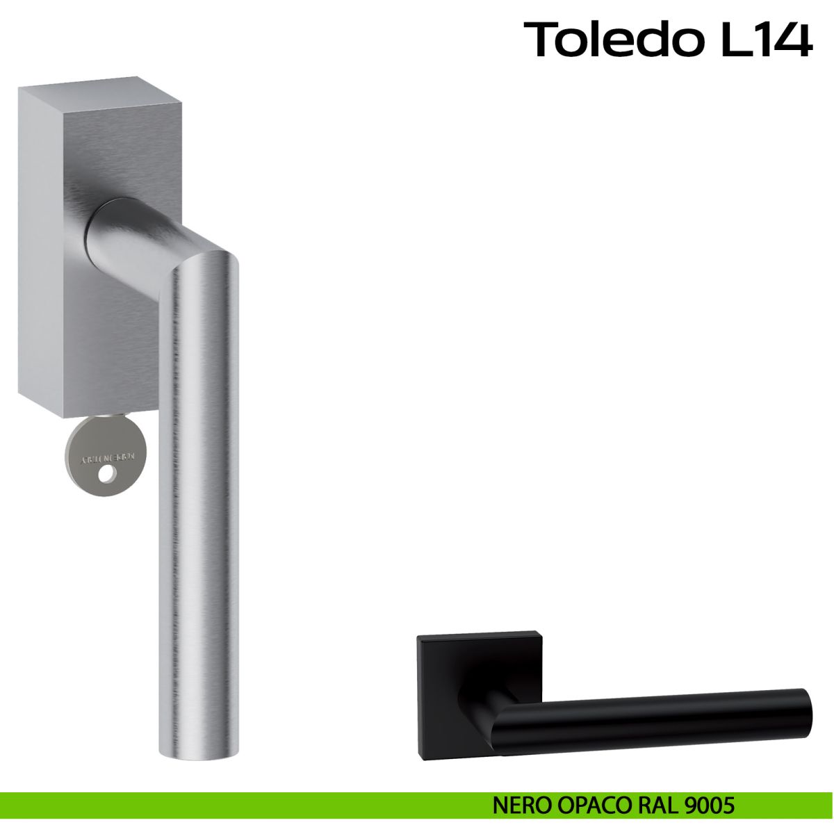 Maniglia in acciaio per finestra martellina DK con chiave su placca Toledo L14 Reguitti con rosetta rettangolare.
