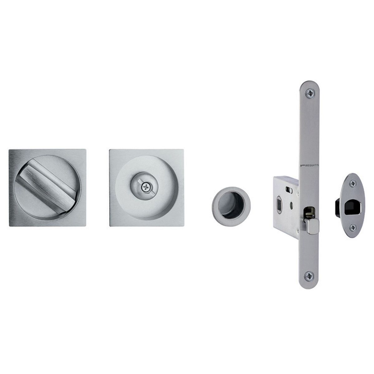 Kit placche incasso quadrate con nottolino per porte scorrevoli Reguitti 873 con frontalino di trascinamento e serratura 026SR. Design by Studio Reguitti.