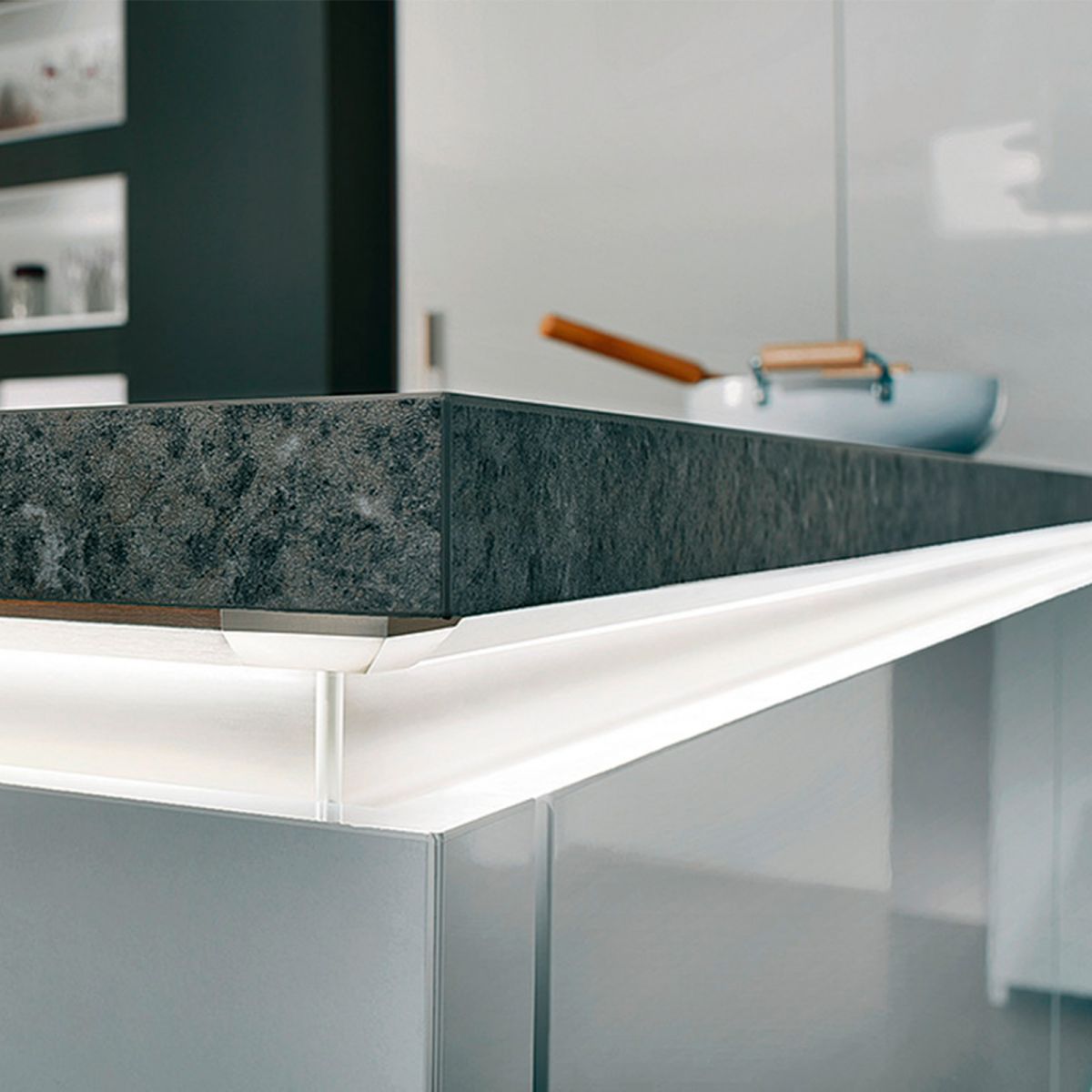 Maniglia a incasso montaggio tra piano di lavoro e frontale in alluminio per mobile Hafele.