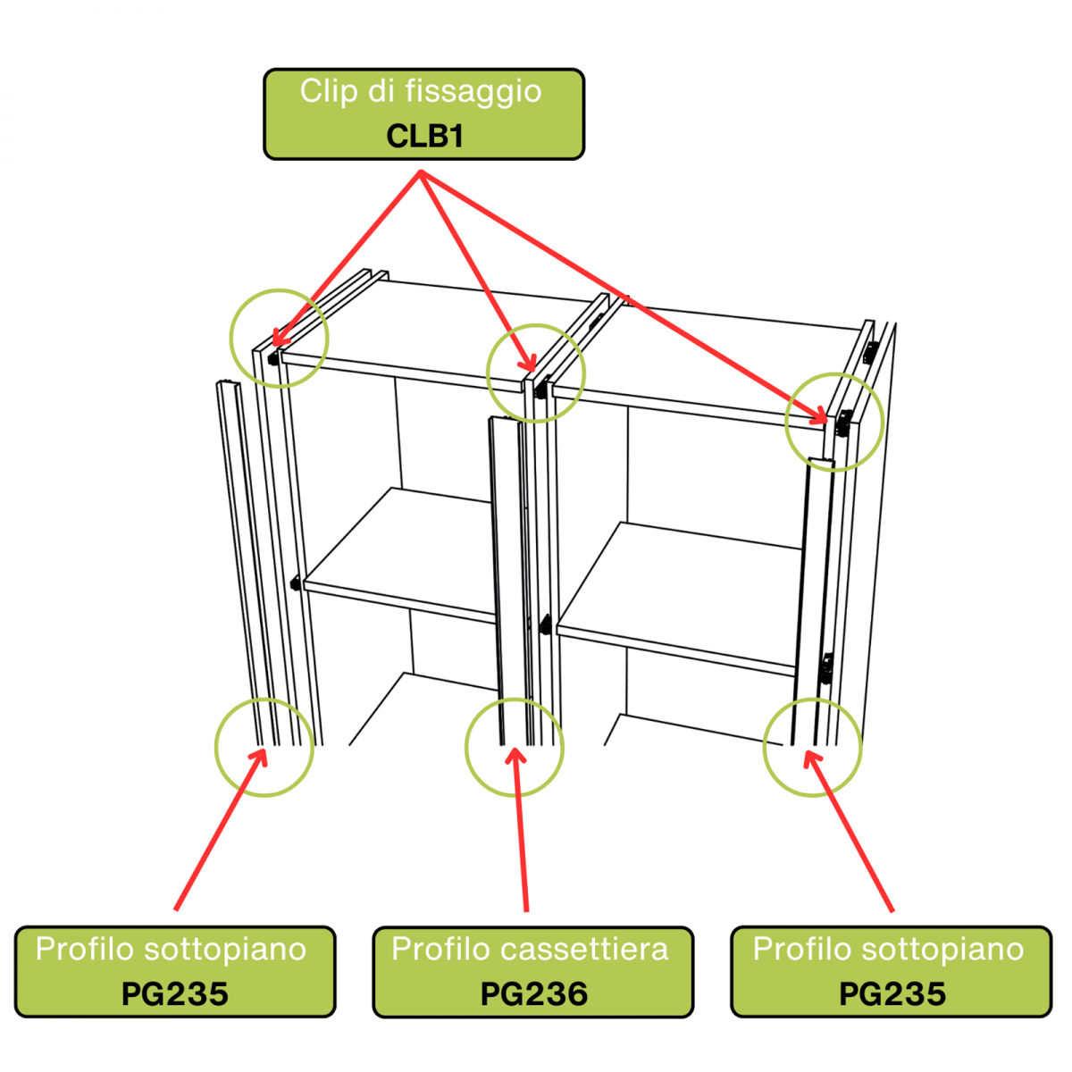 Fissaggio Clip Art per profilo gola in alluminio per cucina Gap Italia CLB1, utilizzabile per base o per elementi a colonna di cucina, fissaggio tramite vite truciolare, sistema brevettato pensato per poter ispezionare e sostituire in qualsiasi momento tutti i sistemi gola.