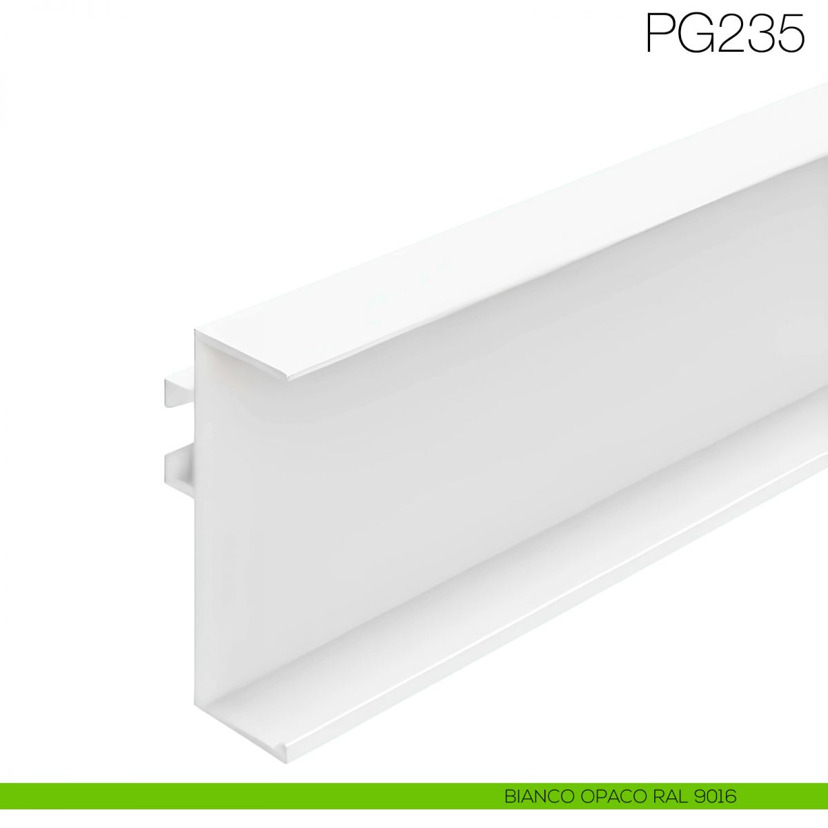 Profilo gola orizzontale e verticale altezza 48 mm Gap Italia articolo PG235, in alluminio verniciabile, raggio zero, utilizzabile per base o per elementi a colonna di cucina, fissaggio tramite clip (da acquistare separatamente), sistema brevettato pensato per poter ispezionare e sostituire in qualsiasi momento tutti i sistemi gola.