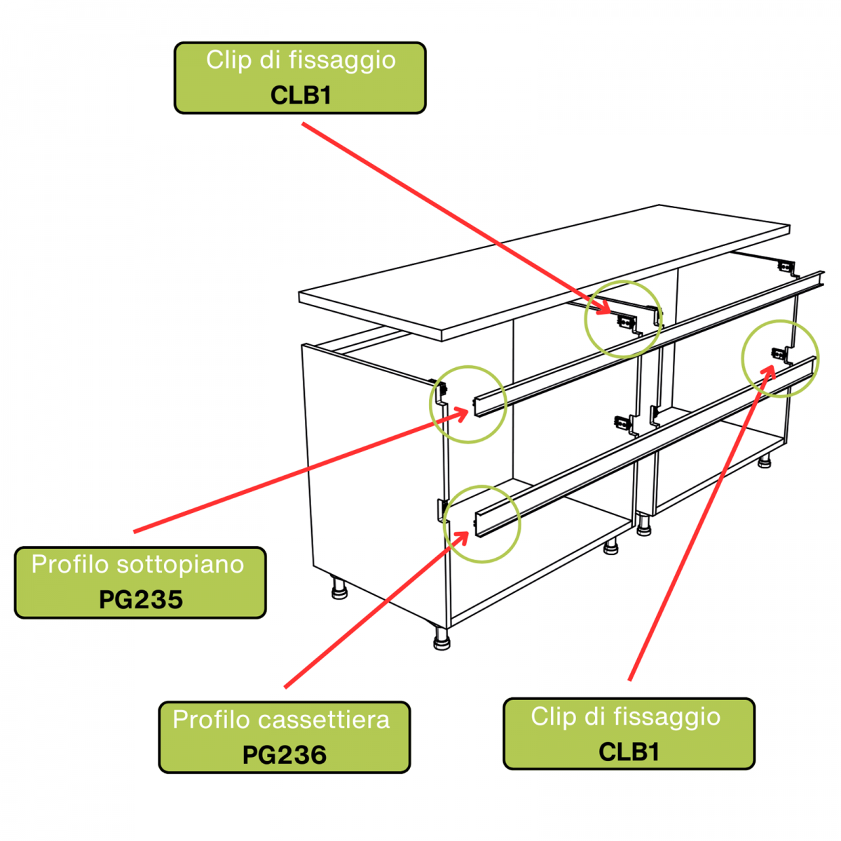 Il Clip Art System di Gap Italia è un sistema brevettato esclusivo che rivoluziona l'utilizzo dei sistemi gola in cucina. Grazie a questo innovativo sistema, è possibile ispezionare e sostituire i profili gola in qualsiasi momento, garantendo una flessibilità e praticità senza precedenti. Tra le soluzioni più apprezzate ci sono la gola per basi con profilo raggio zero, perfetta per chi cerca un design moderno e pulito nella versione profilo gola sottopiano (o sotto top) altezza 48 mm (articolo PG235), ideale per mantenere continuità nei piani di lavoro, e il profilo gola per cassettiera altezza 66 mm (articolo PG236), progettato per garantire ordine e funzionalità in cucina. Questi profili a gola sono perfetti sia per le basi cucina che per le basi a colonna, rendendoli una soluzione versatile e adatta all'intera cucina .Scegliere le gole in alluminio Gap Italia significa dotare la propria cucina di un sistema estetico, funzionale e di facile manutenzione, assicurando uno stile impeccabile e una lunga durata nel tempo.