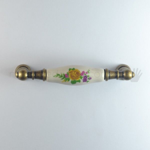Maniglia per mobile con ceramica panna decorata con fiori Metal Style finitura Florance.
