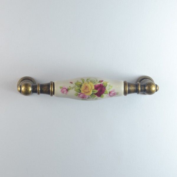 Maniglia per mobile con ceramica panna decorata con fiori Metal Style finitura Florance.