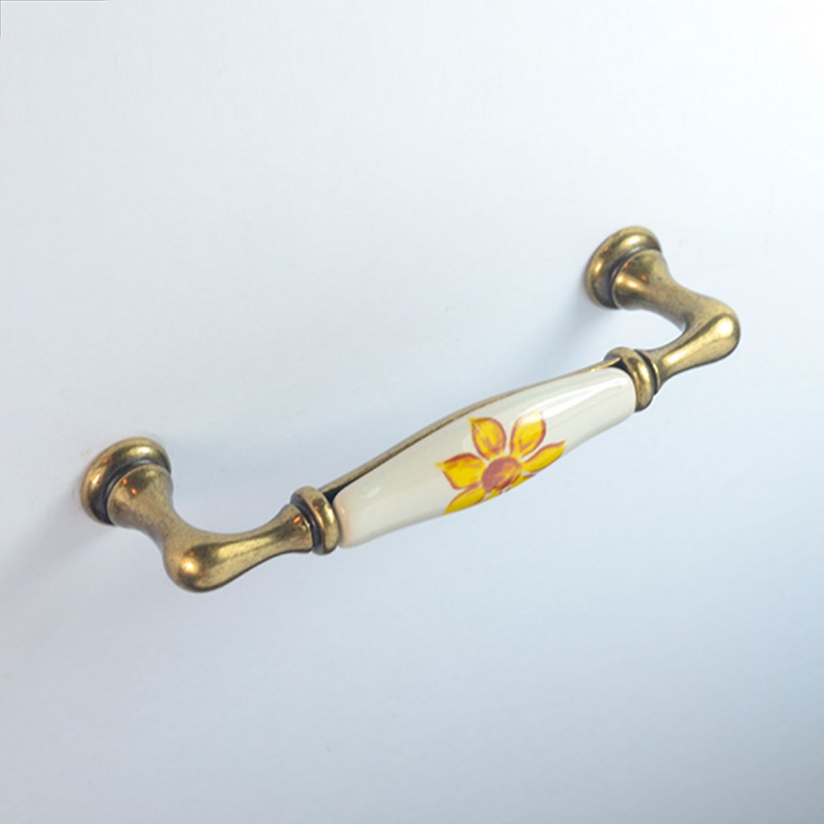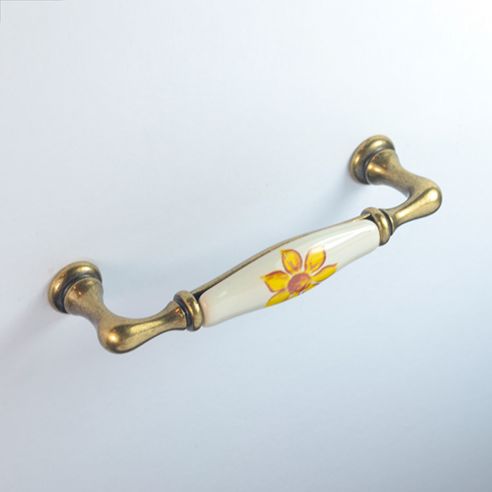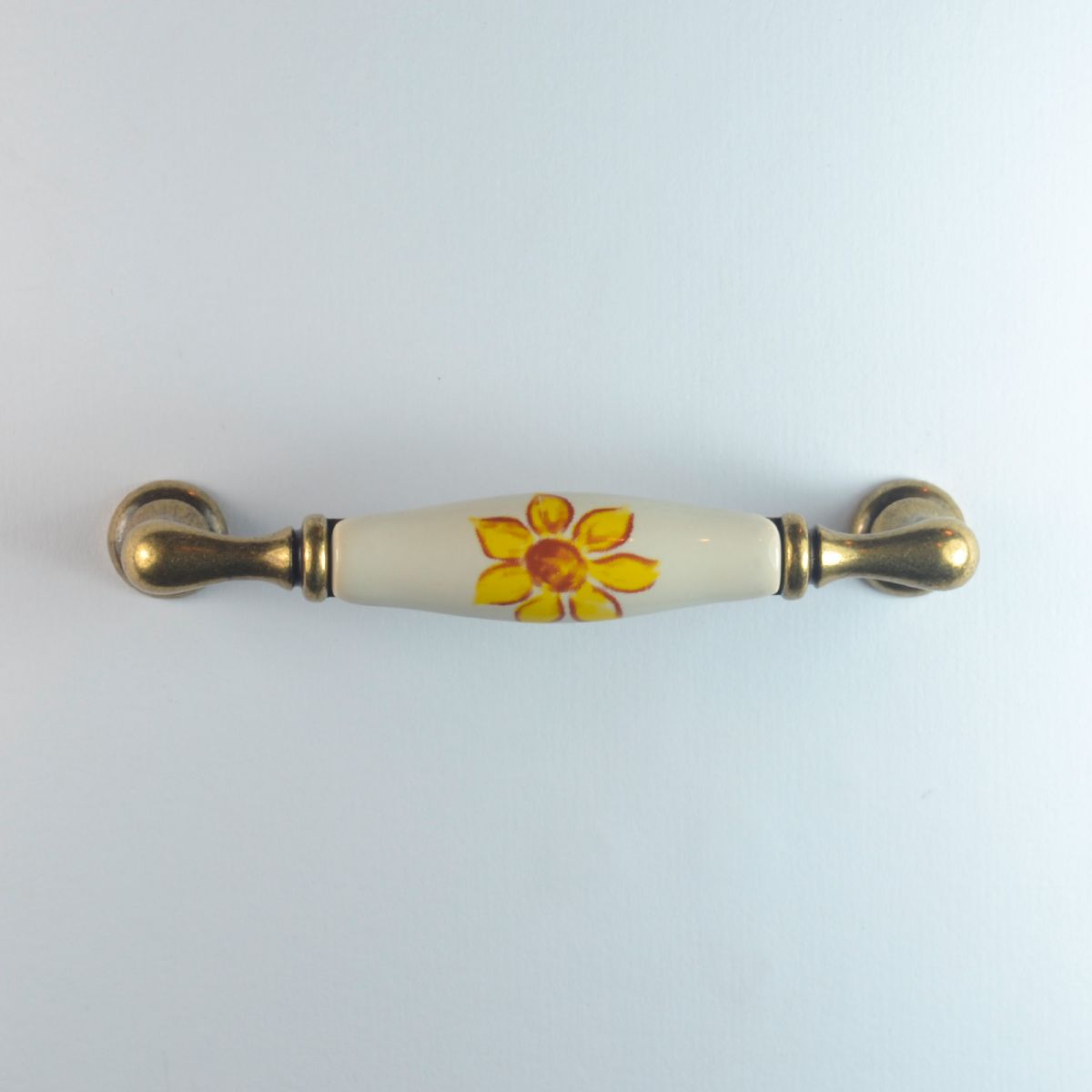 Maniglia per mobile con ceramica avorio decorata con girasole Metal Style finitura ottone antico.
