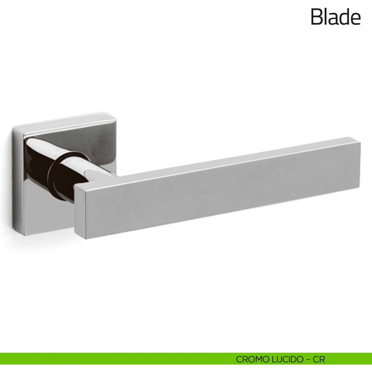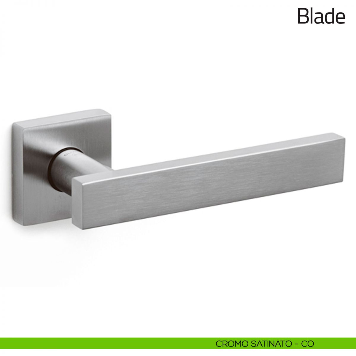 Maniglia per porta interna Blade Olivari con rosetta e bocchetta quadrata.