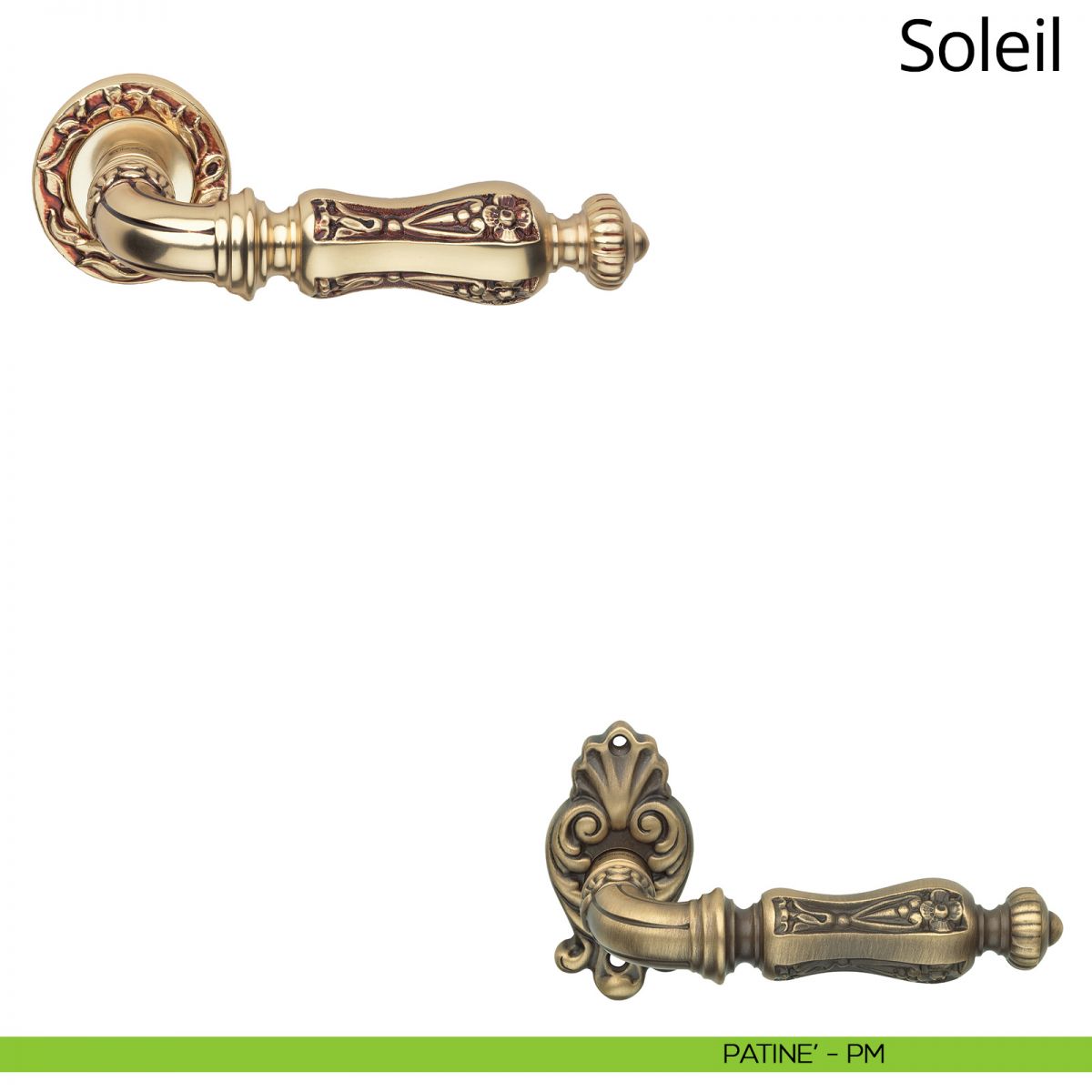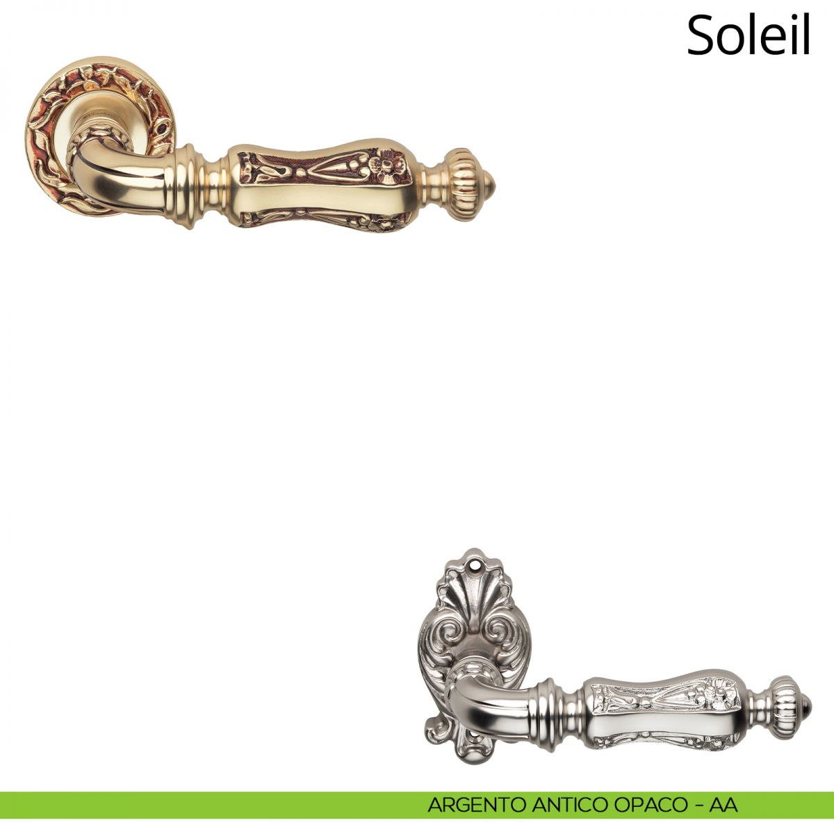 La suntuosità e i fasti di Luigi XIV Borbone, detto il Re Sole, riaffiorano alla mente ammirando la collezione Soleil di Linea Calì. Il pattern composto da graziosi fiori riportati in basso rilievo dona un aspetto “regale” a questa maniglia, resa ancor più importante dai fregi che dominano le estremità e che ricordano alcuni dei pezzi più belli di André-Charles Boulle, L’impugnatura, anch’essa minuziosamente decorata, si presenta invece decisamente austera e trasmette una sensazione di elegante nobiltà. Degni di nota sono i fregi situati sul gambo che la collega alla placca, o bocchetta a seconda del modello; una raffinatezza a riprova della grande cura e attenzione ai dettagli che Linea Calì dedica a ogni sua collezione. Grazie alle numerose finiture, dal prezioso oro zecchino al raffinato argento francese, Soleil si trasforma diventando più discreta o più appariscente riuscendo ad adattarsi al gusto di ogni ambiente.