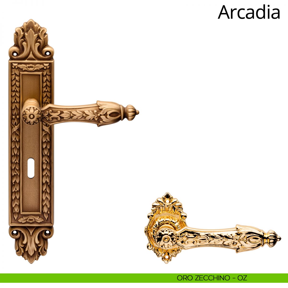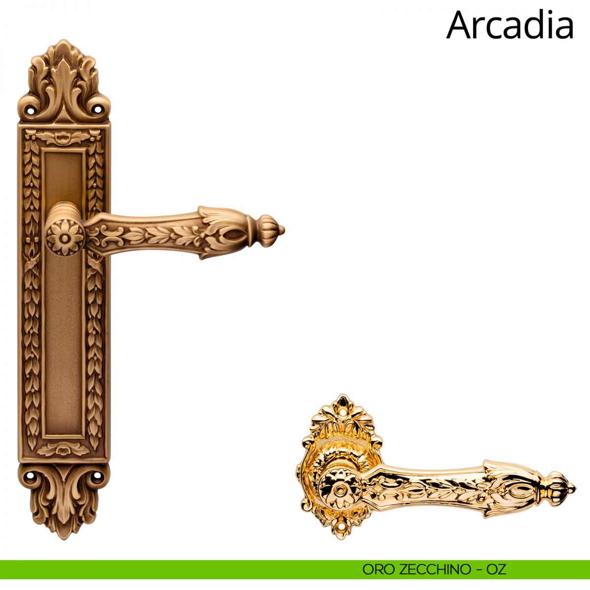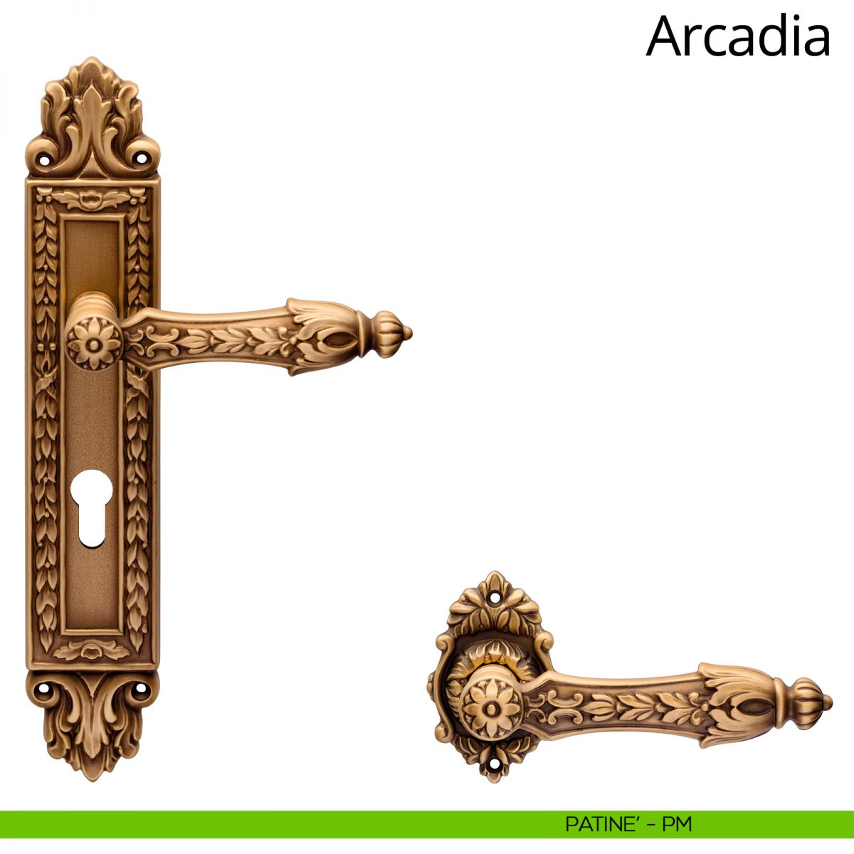 Fra i numerosi stili che hanno caratterizzato la storia dell’arredamento, il Luigi XIV è certamente uno dei più interessanti. Il repertorio decorativo, contraddistinto da un’impostazione simmetrica solenne, vedeva il massiccio uso di suntuose ghirlande; le stesse ghirlande che adornano con gusto la collezione di maniglie per porte Arcadia. In Arcadia la placca di forma squadrata presenta una lavorazione di bocciardatura che conferisce alla superficie un aspetto corrugato, scolpito e in rilievo, che lo rende simile alla pietra naturale grezza, mentre due pregevoli decori le donano slancio rendendola al contempo maestosa. L’impugnatura è stata sottoposta anch’essa a una lavorazione di bocciardatura e si completa da numerosi intarsi che la rendono preziosa e allo stesso tempo morbida sotto la mano. Arcadia Linea Calì è disponibile in più finiture, dal prezioso oro zecchino al vintage patiné, per finire con l’oro e il nero francese. Queste due ultime finiture sono frutto di delicate lavorazioni manuali, eseguite da artigiani italiani, che rendono ogni prodotto unico.