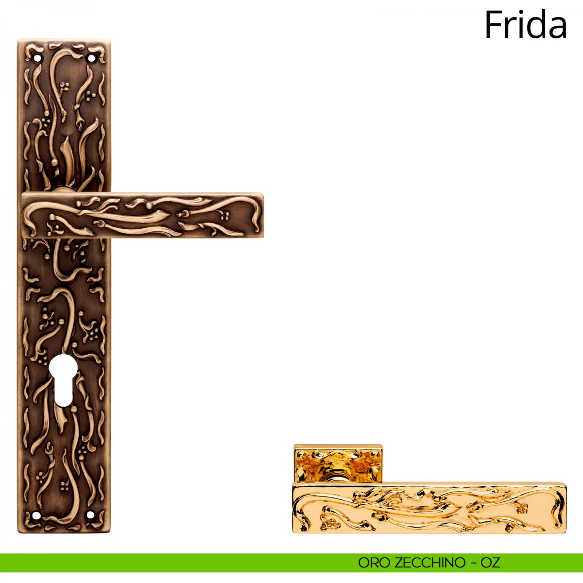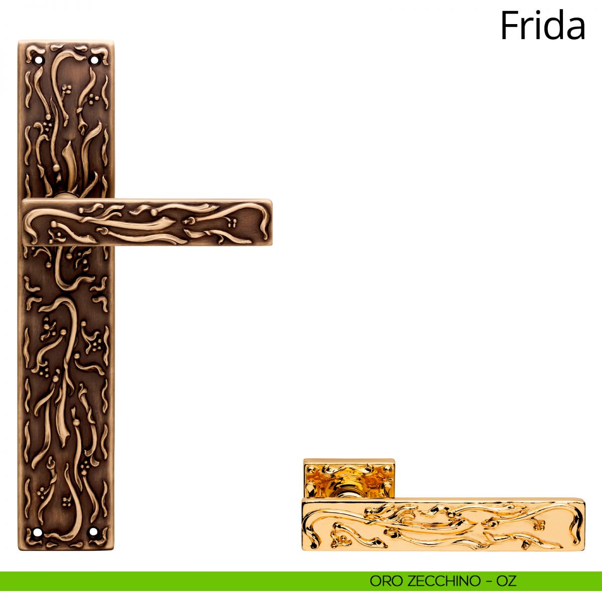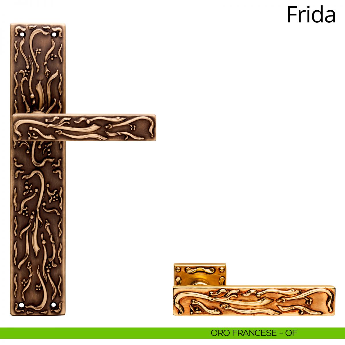 Esuberante e all’avanguardia, come l’artista da cui prende il nome, Frida Kahlo, la collezione di maniglie per porte Frida è un’autentica novità nel mondo della maniglieria tradizionale. Le sue forme, squadrate e rigorose, sono marcate da fregi sinuosi, simili a segni di pittura; è quasi come se un’abile pittrice si fosse divertita a decorarle con delicati tocchi di pennello. Per garantire la loro perfetta esecuzione, ed essere valorizzati dal particolare processo di lucidatura, lo stampo utilizzato per questa maniglia è caratterizzato da un’elevatissima precisione, la stessa che Linea Calì ripone in ogni collezione di alta gamma. La serie di maniglie vintage Frida è disponibile in tre finiture, fra le quali spicca il prezioso oro francese, con le sue delicate e splendenti nuance che vanno dall’oro al bordeaux. Con le sue forme importanti e artistiche, la collezione di maniglie Frida arreda ogni ambiente donandogli un’aria sofisticata ed elegante.