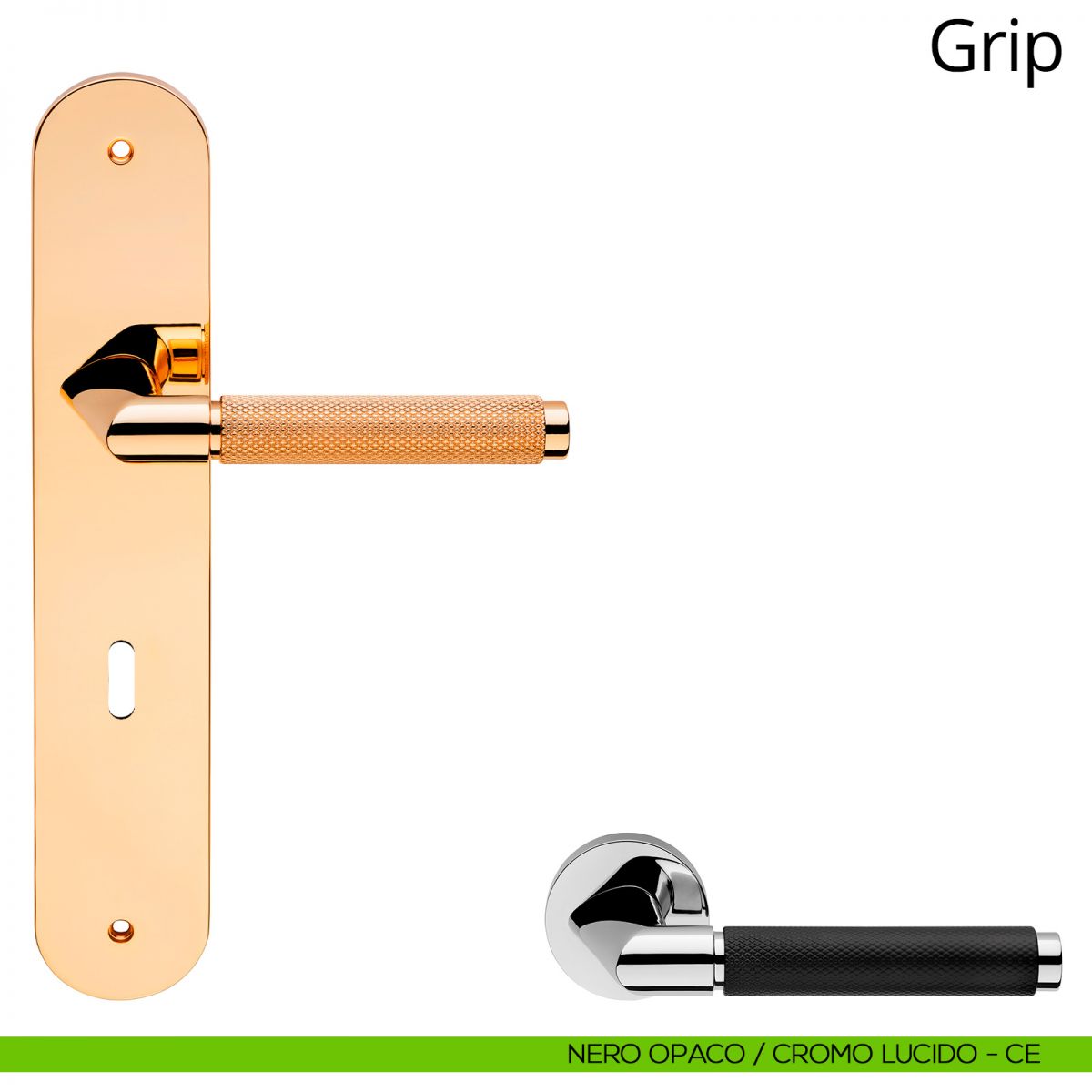 L’elemento che più questa maniglia la contraddistingue è certamente l’impugnatura di forma cilindrica incisa da striature incrociate. Questa particolare zigrinatura a diamante, oltre che a essere decorativa, rende la presa sicura e infonde un delicato e piacevole massaggio alla mano. Questo particolare effetto è ottenuto grazie alla godronatura. Nata originariamente per riportare le superfici dei pistoni di un motore consumato alle dimensioni originali, è stata adottata anche dal mondo dell’arredo e del design per la sua peculiare texture che aumenta il grip di ogni superficie. Grazie a questa particolare lavorazione, la maniglia Grip si trasforma a seconda della finitura scelta. La versione nera opaca e cromo lucido si presta ad ambienti moderni dove si richiede l’inserimento di un complemento di arredo con un’immagine dalla forte connotazione tecnica. Scelta in oro zecchino, invece, si ingentilisce sposandosi perfettamente a porte pantografate in stile déco, sia laccate che in legno. Anche questa collezione è realizzata esclusivamente in Italia, all’interno del distretto industriale della provincia di Brescia, nel rispetto delle più recenti normative Europee.