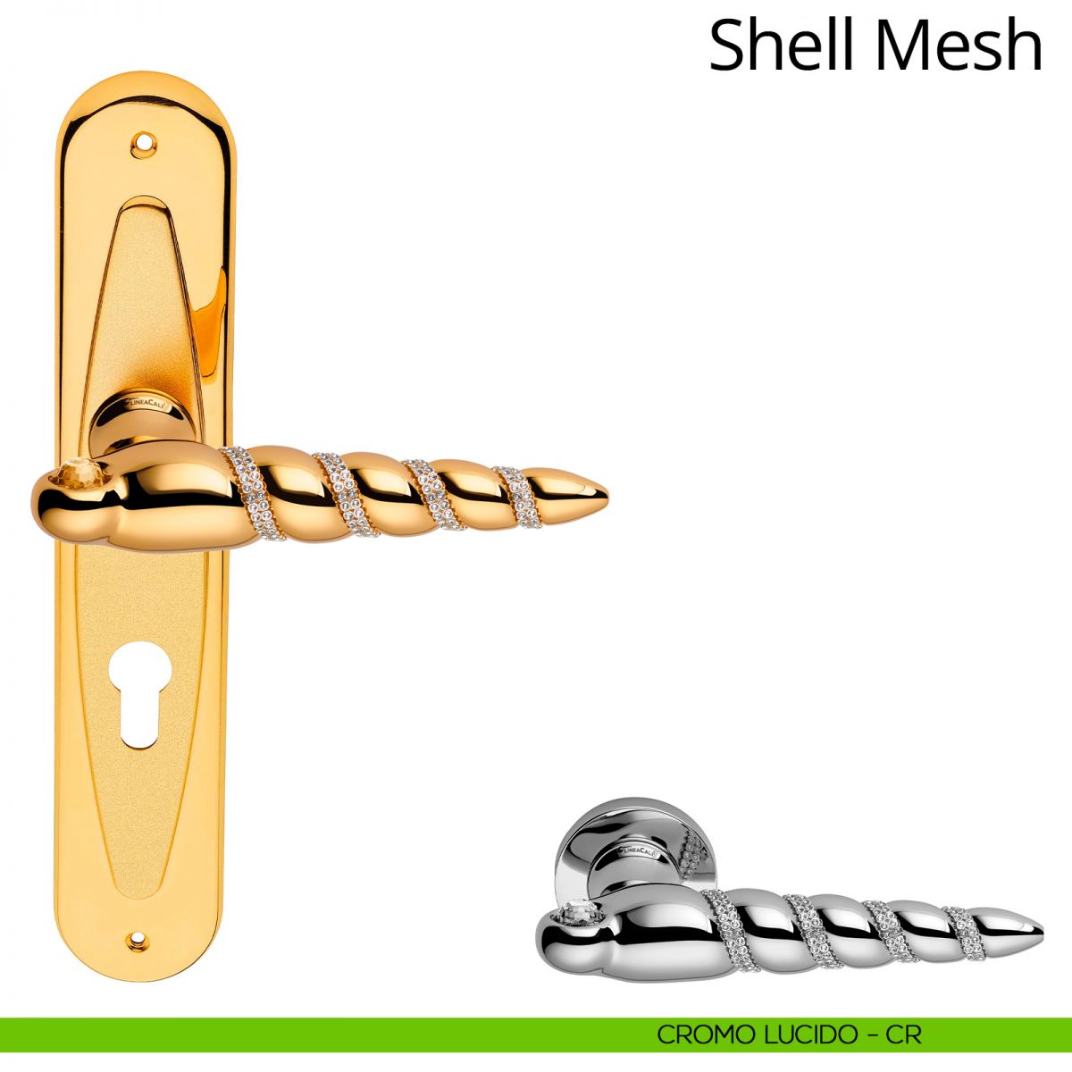 Dalla particolare forma con giri convessi, Shell Mesh è la nuovissima serie di maniglie Linea Calì che entra a far parte della linea Crystal. Un filo di originali cristalli Swarovski® ne esalta la forma, mentre un grosso cristallo incastonato (sempre in cristallo Swarovski®) ne riflette il colore completando l’effetto finale e rendendola simile a un gioiello appartenente ad un vecchio tesoro ritrovato su di un’isola deserta. Appartenente anch’essa alla “spring/summer collection 2013”, Shell Mesh è si è contraddistinta fin da subito anche per la particolarissima forma che ricorda la rarissima conchiglia del Golfo di Gabes (Tunisia), scoperta da De Folin nel 1869 e soprannominata “Ebala Gracillima”.