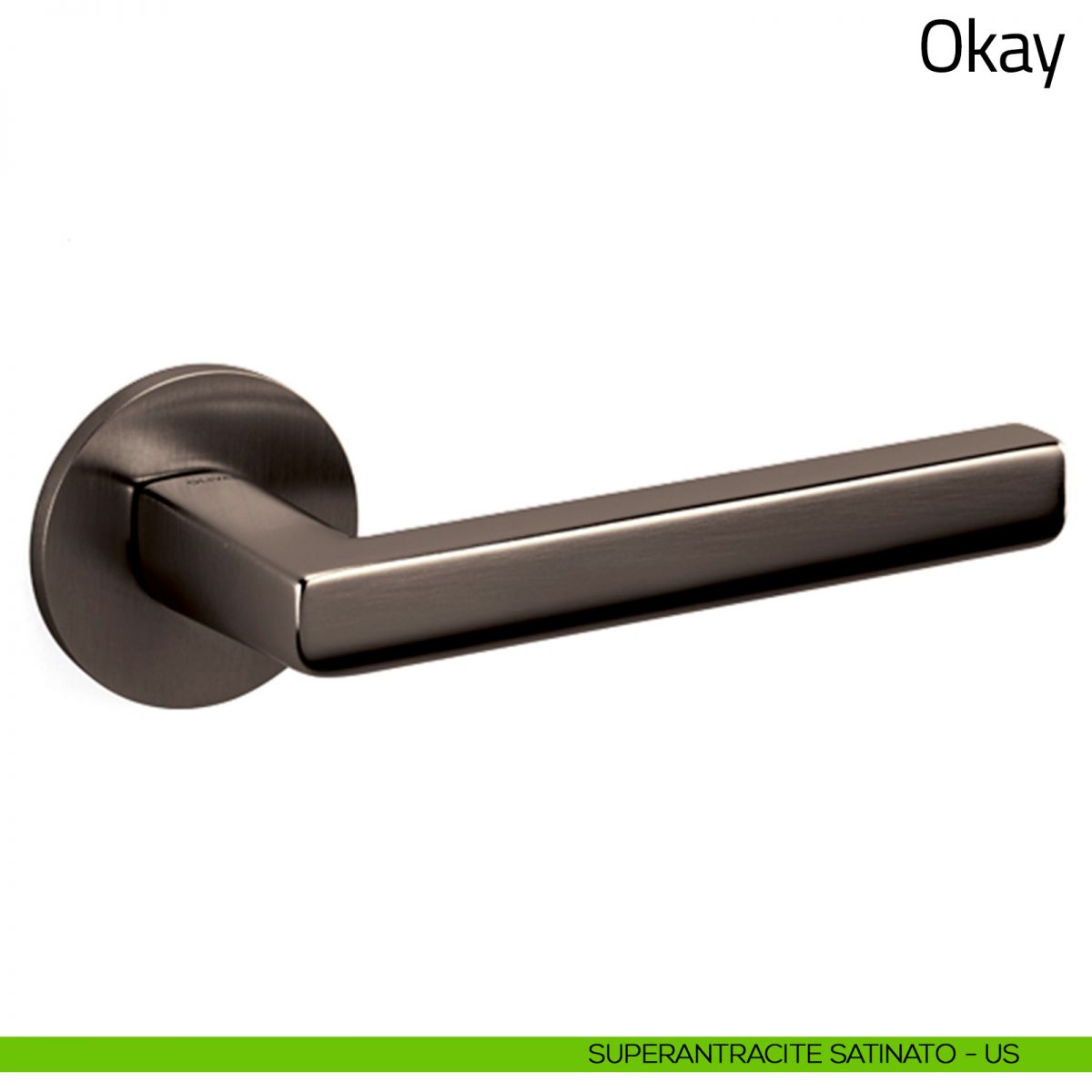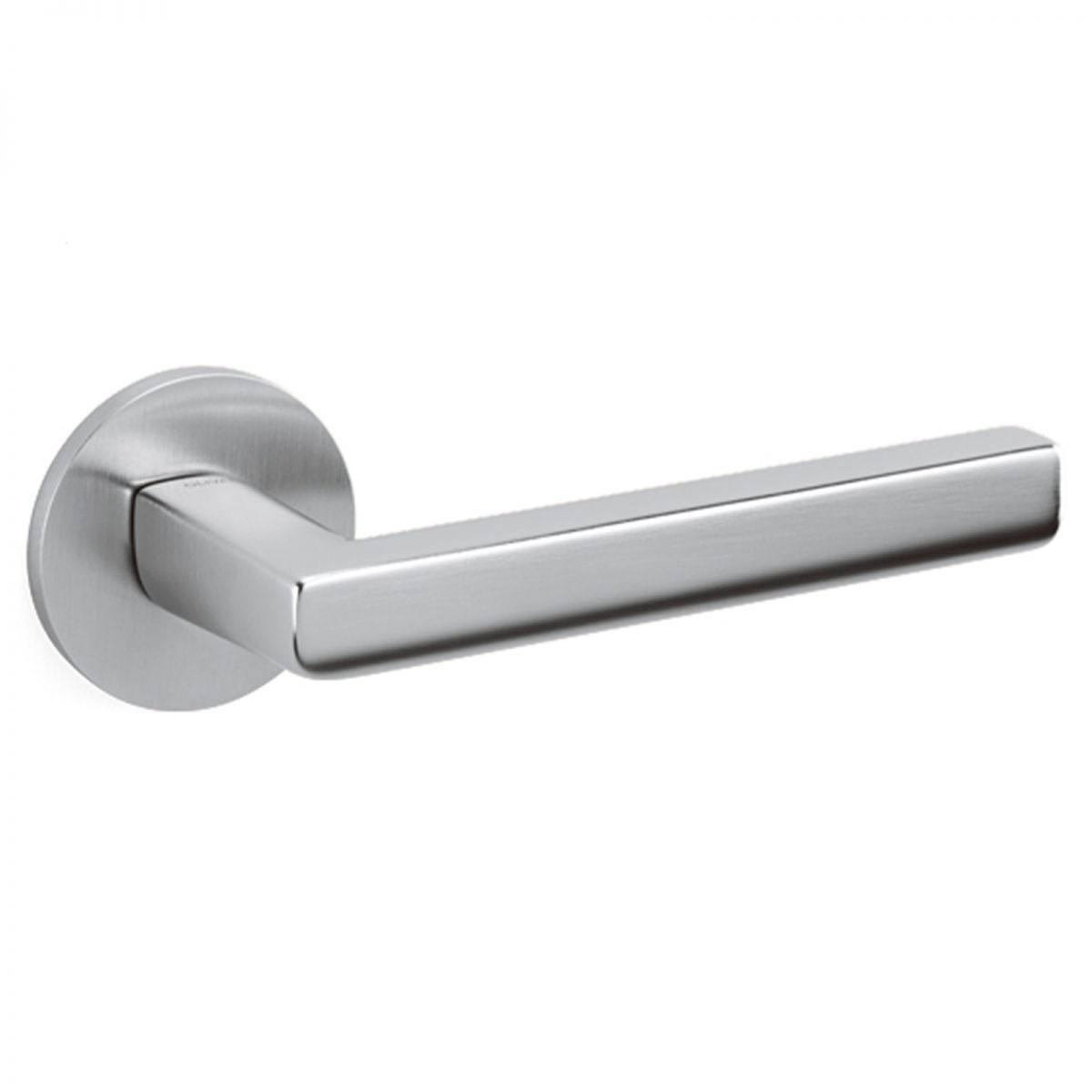 Maniglia per porta interna Okay Olivari con rosetta e bocchetta tonda bassa. Design by Michael Anastassiades.