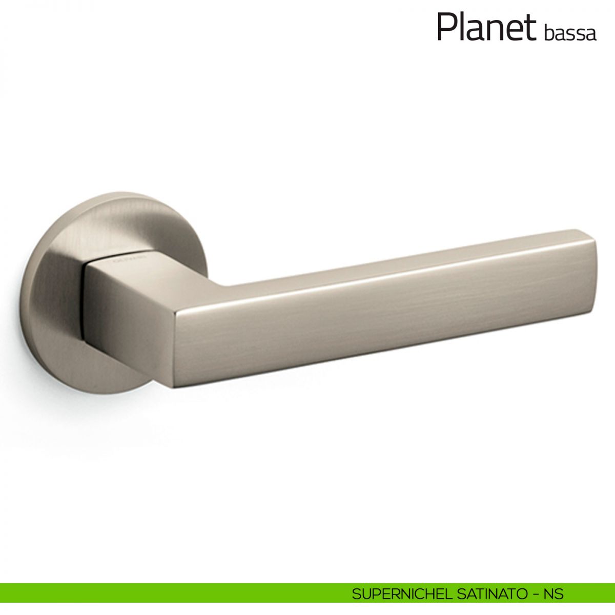 Maniglia per porta interna Planet Olivari con rosetta e bocchetta tonda bassa.