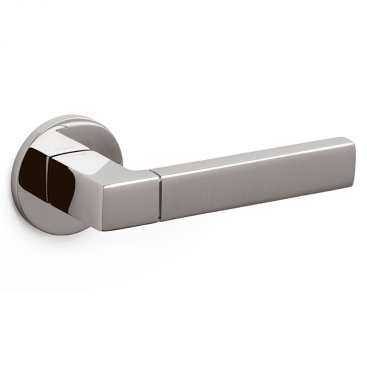 Maniglia per porta interna Planet bicolor Olivari con rosetta e bocchetta tonda bassa. Design by Luca Casini.