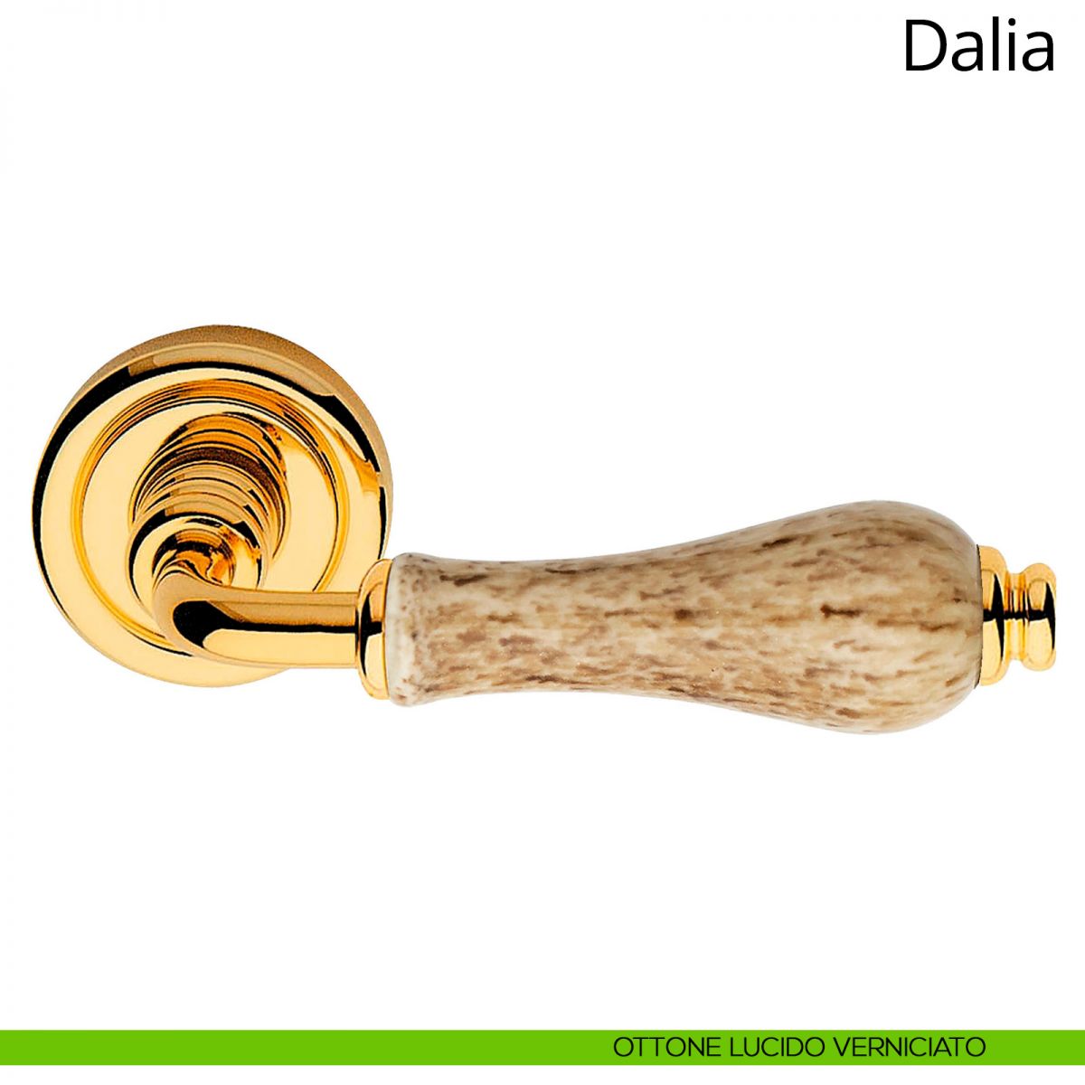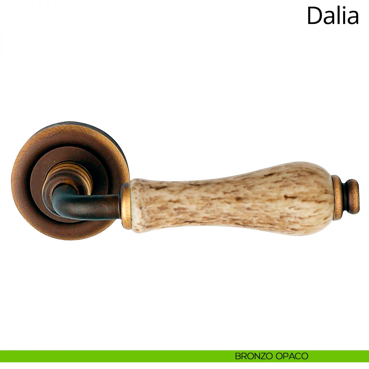 La collezione di maniglie Dalia è un classico della maniglieria italiana, un viaggio oltre il tempo e le mode. Progettata nel lontano 1990, da allora continua a mietere consensi per via delle sue forme morbide, piacevolmente classiche e femminili. La bocchetta minuta è stata ideata consapevolmente per accompagnarsi ai profili stretti dei serramenti in legno di un tempo, mentre la forme “a clessidra” dell’impugnatura accoglie la mano con un’inaspettata sensazione di morbidezza. Ed è proprio l’impugnatura a fare la differenza; le sue delicate proporzioni si bilanciano perfettamente con il gambo e la bocchetta in un susseguirsi di curve e rilievi, leit motiv di questa collezione di maniglie. La preziosa impugnatura in ceramica italiana della collezione Dalia è disponibile in numerose fantasie e colori, fra i quali spicca la porcellana beige (perfetta per tutti i serramenti di legno scuro, come l’iroko), fino all’ultima arrivata: l’insolita porcellana maculata. Degne di nota sono anche le numerose varianti floreali (fiore rosa, fiore marrone e fiore blu) decorate da sapienti mani artigiane. L’ampia gamma di modelli a catalogo consente a Dalia di adattarsi a tutte le tipologie di porte e finestre, mentre le 35 varianti disponibili le permettono di adattarsi a tutte le tipologie di ambienti, dal classico al country-chic.