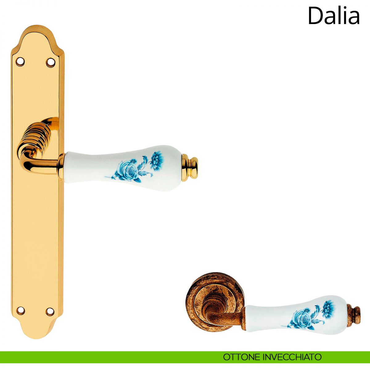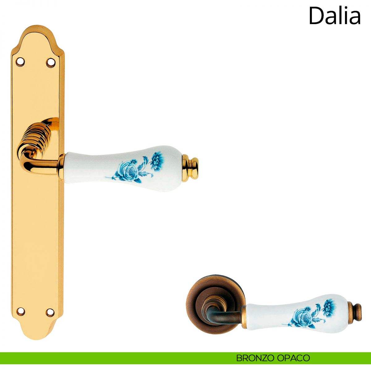 La collezione di maniglie Dalia è un classico della maniglieria italiana, un viaggio oltre il tempo e le mode. Progettata nel lontano 1990, da allora continua a mietere consensi per via delle sue forme morbide, piacevolmente classiche e femminili. La bocchetta minuta è stata ideata consapevolmente per accompagnarsi ai profili stretti dei serramenti in legno di un tempo, mentre la forme “a clessidra” dell’impugnatura accoglie la mano con un’inaspettata sensazione di morbidezza. Ed è proprio l’impugnatura a fare la differenza; le sue delicate proporzioni si bilanciano perfettamente con il gambo e la bocchetta in un susseguirsi di curve e rilievi, leit motiv di questa collezione di maniglie. La preziosa impugnatura in ceramica italiana della collezione Dalia è disponibile in numerose fantasie e colori, fra i quali spicca la porcellana beige (perfetta per tutti i serramenti di legno scuro, come l’iroko), fino all’ultima arrivata: l’insolita porcellana maculata. Degne di nota sono anche le numerose varianti floreali (fiore rosa, fiore marrone e fiore blu) decorate da sapienti mani artigiane. L’ampia gamma di modelli a catalogo consente a Dalia di adattarsi a tutte le tipologie di porte e finestre, mentre le 35 varianti disponibili le permettono di adattarsi a tutte le tipologie di ambienti, dal classico al country-chic.
