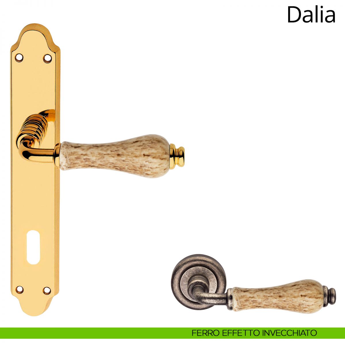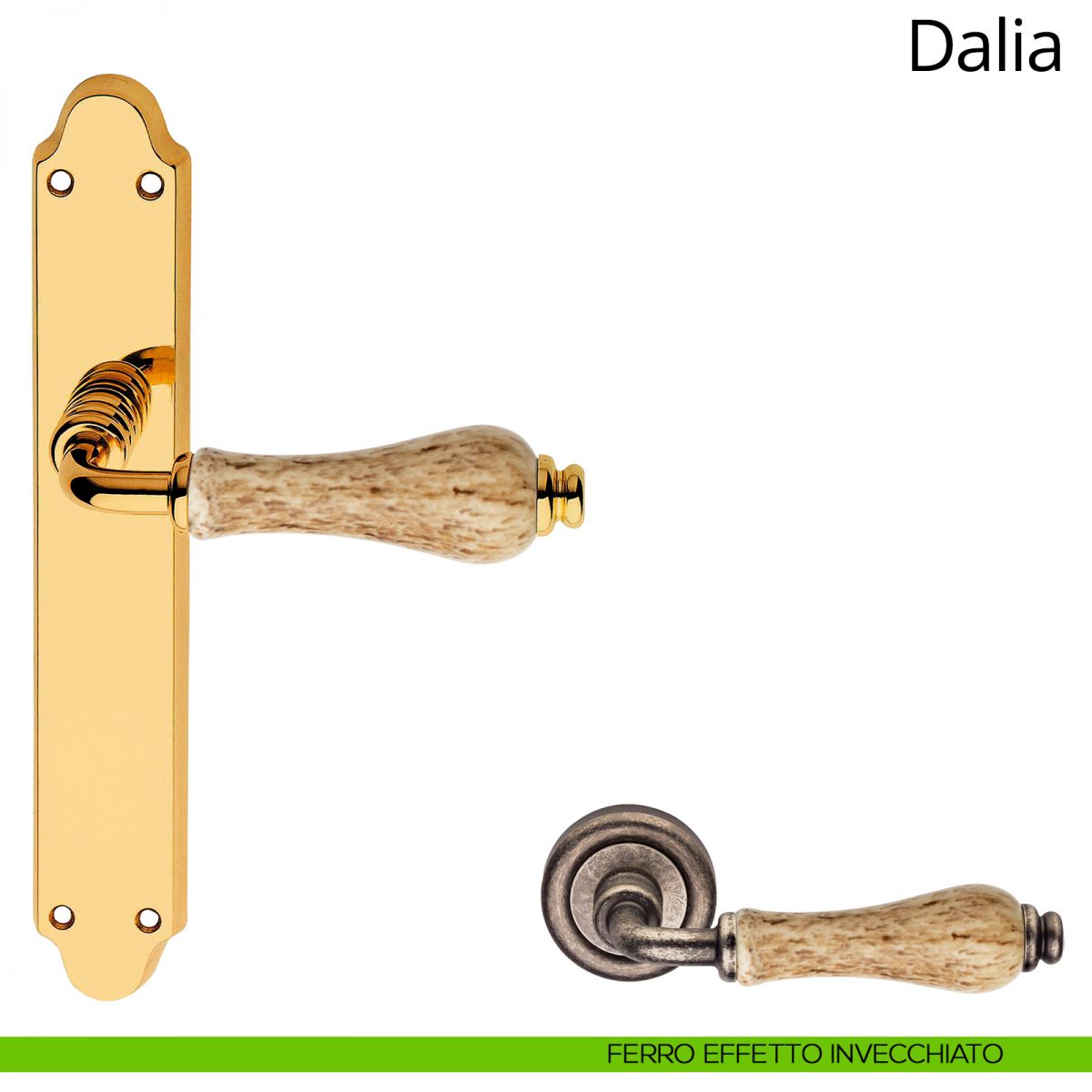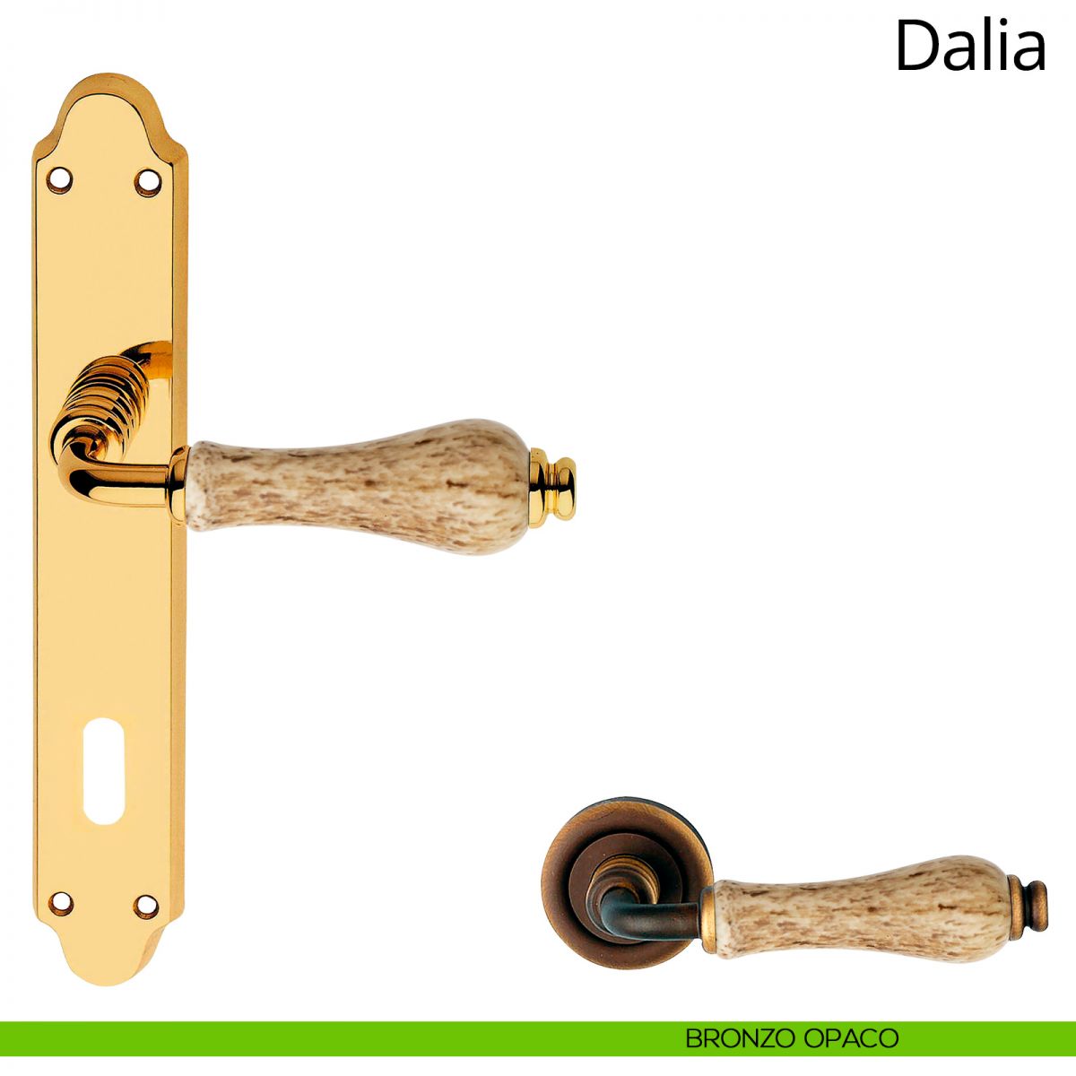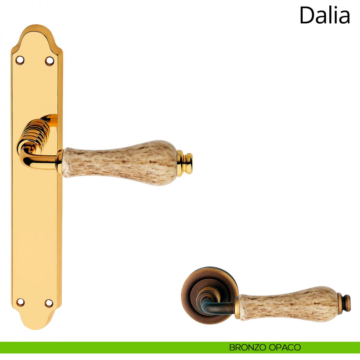 La collezione di maniglie Dalia è un classico della maniglieria italiana, un viaggio oltre il tempo e le mode. Progettata nel lontano 1990, da allora continua a mietere consensi per via delle sue forme morbide, piacevolmente classiche e femminili. La bocchetta minuta è stata ideata consapevolmente per accompagnarsi ai profili stretti dei serramenti in legno di un tempo, mentre la forme “a clessidra” dell’impugnatura accoglie la mano con un’inaspettata sensazione di morbidezza. Ed è proprio l’impugnatura a fare la differenza; le sue delicate proporzioni si bilanciano perfettamente con il gambo e la bocchetta in un susseguirsi di curve e rilievi, leit motiv di questa collezione di maniglie. La preziosa impugnatura in ceramica italiana della collezione Dalia è disponibile in numerose fantasie e colori, fra i quali spicca la porcellana beige (perfetta per tutti i serramenti di legno scuro, come l’iroko), fino all’ultima arrivata: l’insolita porcellana maculata. Degne di nota sono anche le numerose varianti floreali (fiore rosa, fiore marrone e fiore blu) decorate da sapienti mani artigiane. L’ampia gamma di modelli a catalogo consente a Dalia di adattarsi a tutte le tipologie di porte e finestre, mentre le 35 varianti disponibili le permettono di adattarsi a tutte le tipologie di ambienti, dal classico al country-chic.