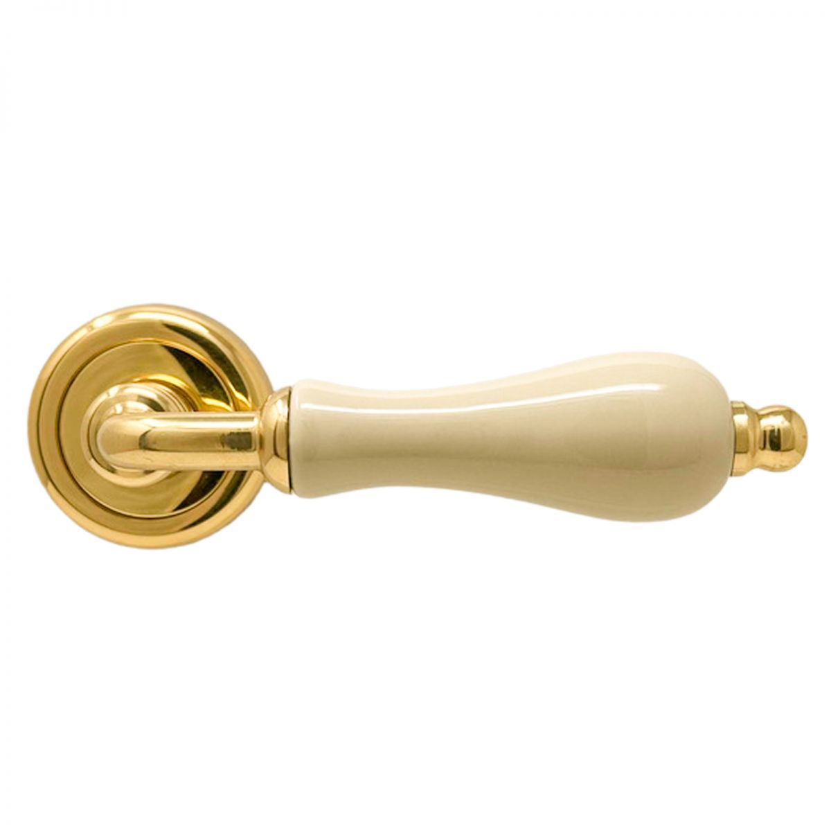 Maniglia per porta porcellana champagne e ottone lucido Samoha Nestori con rosetta e bocchetta tonda.