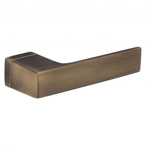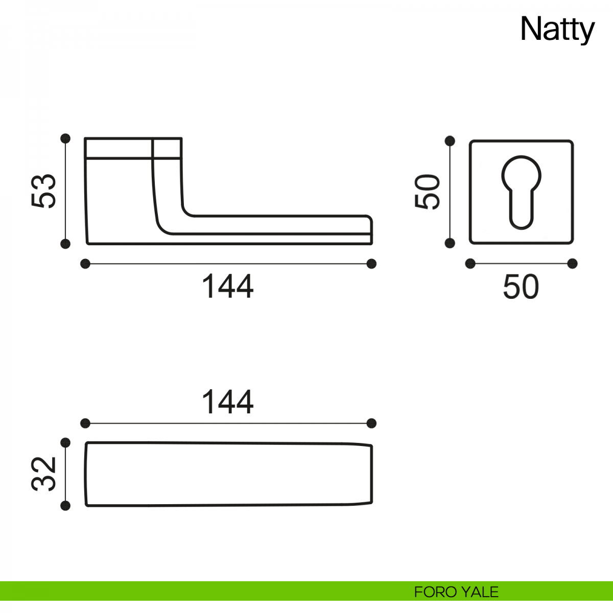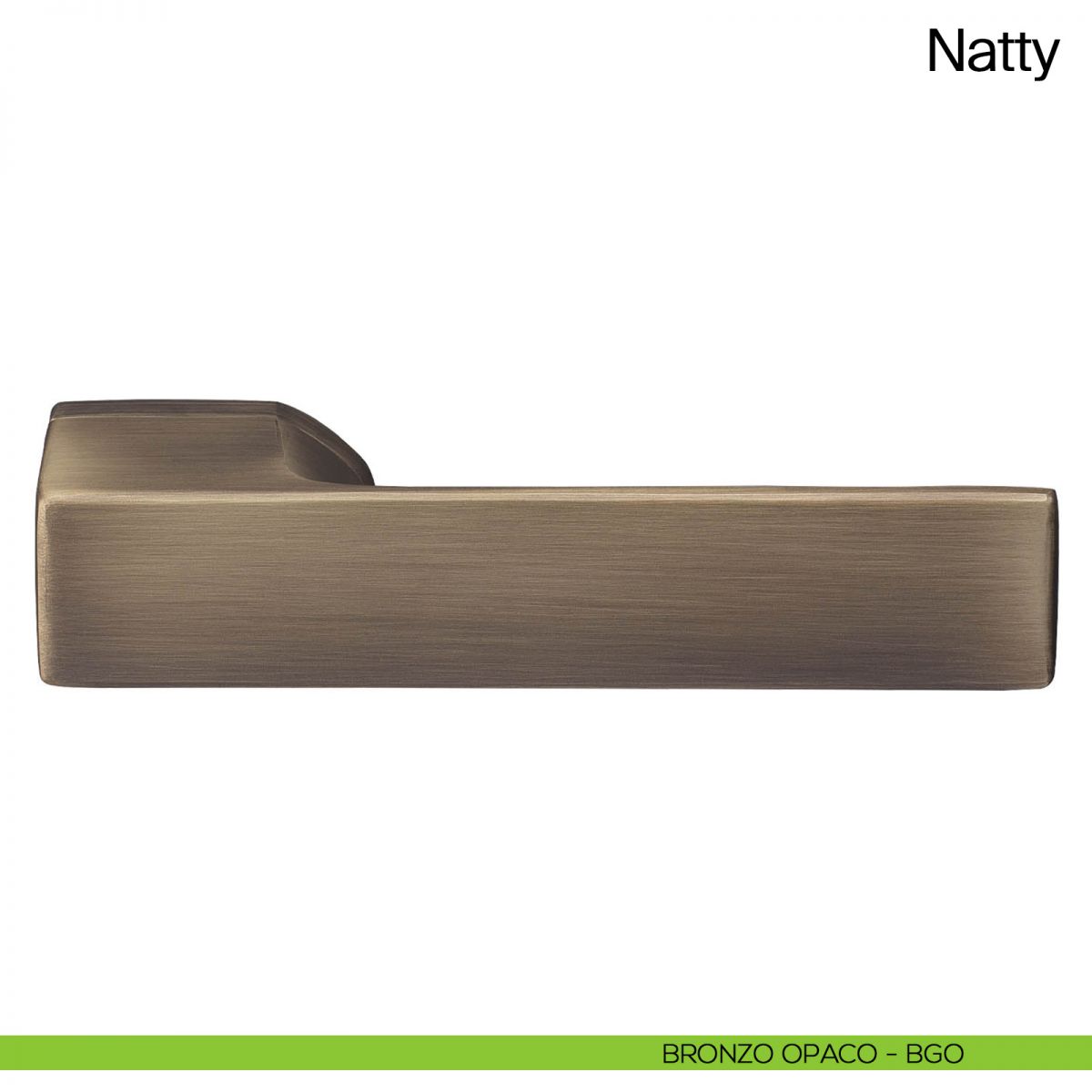 Maniglia per porta Natty Manital con rosetta e bocchetta rettangolare. Design by Mario Mazzer e Giovanni Crosera.