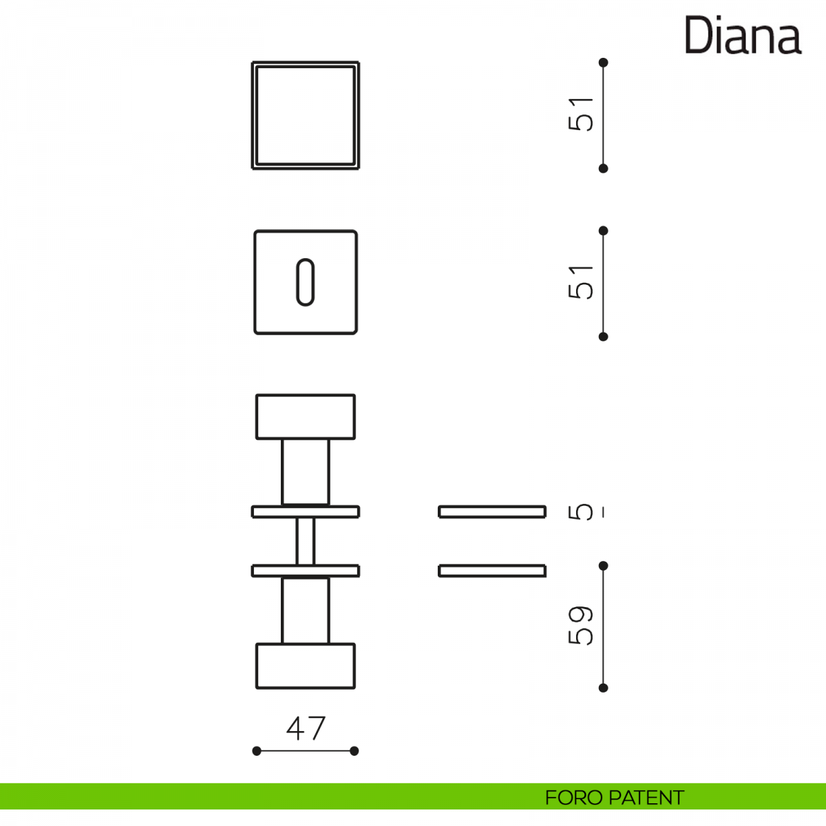 Pomello per porta interna Diana girevole Olivari con rosetta e bocchetta quadrata bassa. Design by Studio Olivari.