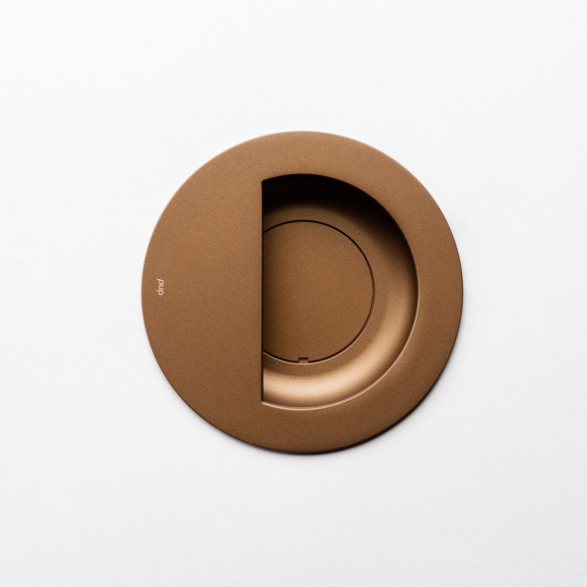 Maniglia ad incasso per porta a battente Interna dnd Handles, diametro esterno ø100 mm, diametro foratura ø90 mm, venduta a coppia comprensiva di viti di collegamento e istruzione di montaggio. Design by Giulio Iacchetti.