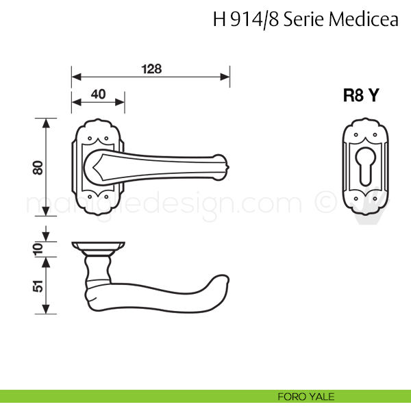 Maniglia per porta interna H 914/8 Medicea Valli & Valli con rosetta e bocchetta. Design by Pasquale Valli.