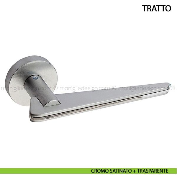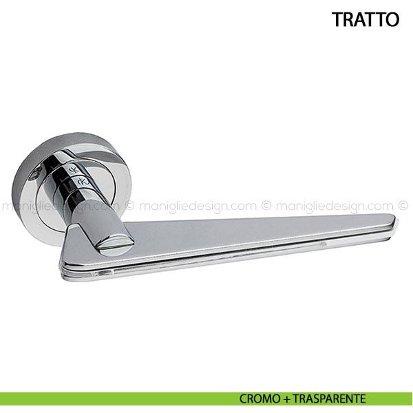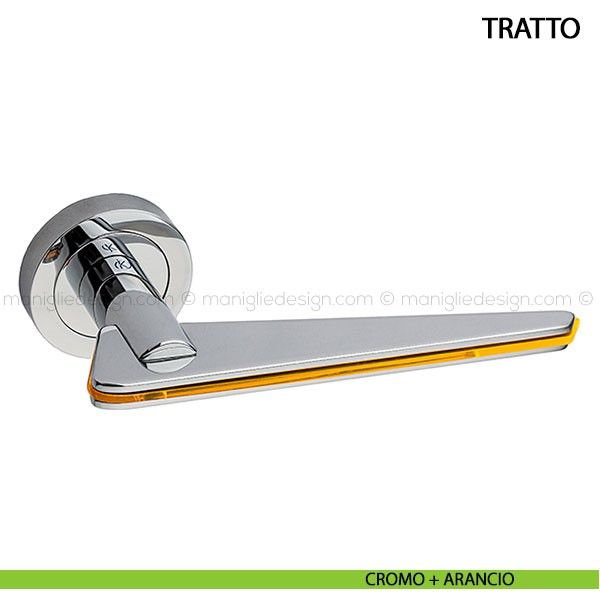 Tratto è un segno lucido, che cattura l'occhio, la luce, e indica la porta con l'ironia fluorescente dell'evidenziatore. E' una linea di colore, una linea d'azione, un'insegna racchiusa in parentesi di metallo cromato o nero profondo che pongono l'oggetto quale ombra di sè stesso me lasciano in risalto la funzione, l'invito a prendere, o lasciare. Tratto è una maniglia in lega leggera e inserto in metacrilato fluorescente La maniglia è disponibile nelle finiture cromo lucido e cromo satinato con inserti in arancio e trasparente.