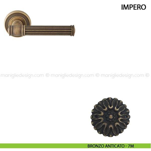 La maniglia per porta interna Impero è stata pensata per chi desidera una maniglia classica per l'arredamento in stile antico. La maniglia Impero Comit è l'accessorio per porta ideale per tutti gli ambienti che traggono ispirazione dal passato. Impreziosita da affascinanti particolari retrò, come le finiture in ottone anticato, la maniglia d'epoca arreda diverse tipologie di abitazione. Disegnata da abili maestri che lavorano l'ottone, la maniglia per interni Impero si contraddistingue per i motivi ornamentali che si intrecciano dando vita a un prodotto unico nel suo genere. Impero viene prodotta dalle sapienti mani di artigiani italiani, che intraprende il desiderio del disegnatore che l'ha ideata. Le maniglie classiche per porte Comit sono un elemento d'arredo indispensabile per gli habitat più tradizionali e arredano con gusto e stile permettendo a chiunque di abbinarle facilmente a tutte le tipologie di porte interne e finiture in legno. La maniglia in ottone bronzato Impero è stata pensata per valorizzare ogni ambiente con un tocco di design Made in Italy.