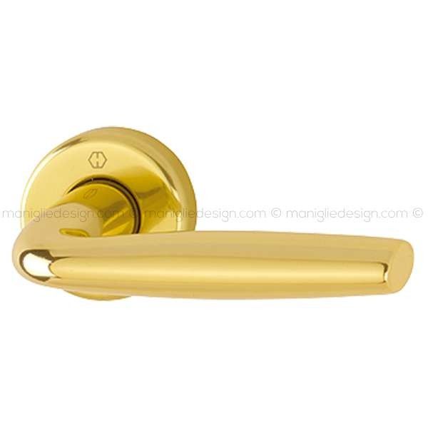 Maniglia per porta Milos Hoppe dorato lucido con rosetta e bocchetta tonda foro patent.
