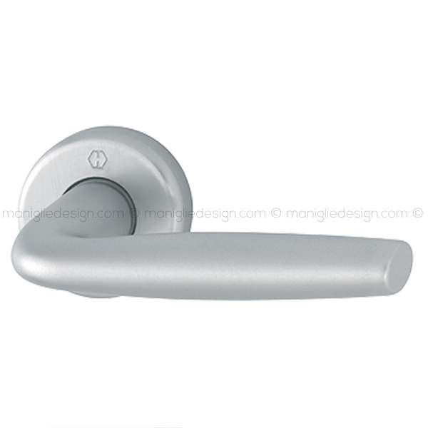 Maniglia per porta Milos Hoppe alluminio satinato con rosetta e bocchetta tonda foro patent.