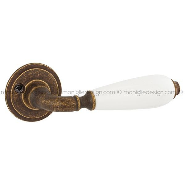 Maniglia in porcellana per porta interna 069 Cinzia Reguitti con viti a vista, rosetta e bocchetta tonda.