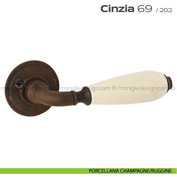 Maniglia in porcellana per porta interna con nottolino 069 Cinzia Reguitti con viti a vista, con rosetta.