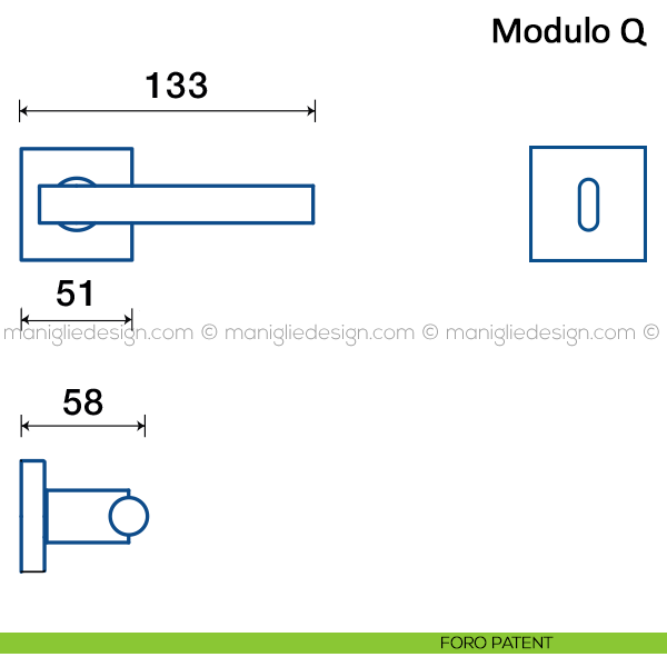 Maniglia per porta interna Modulo Q Frascio con rosetta e bocchetta quadrata. Design by Frascio Design.