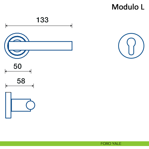 Maniglia per porta interna Modulo L Frascio con rosetta e bocchetta tonda. Design by Frascio Design.