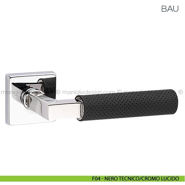 Maniglia con impugnatura in pelle per porta Bau Fimet Handles su rosetta quadrata.